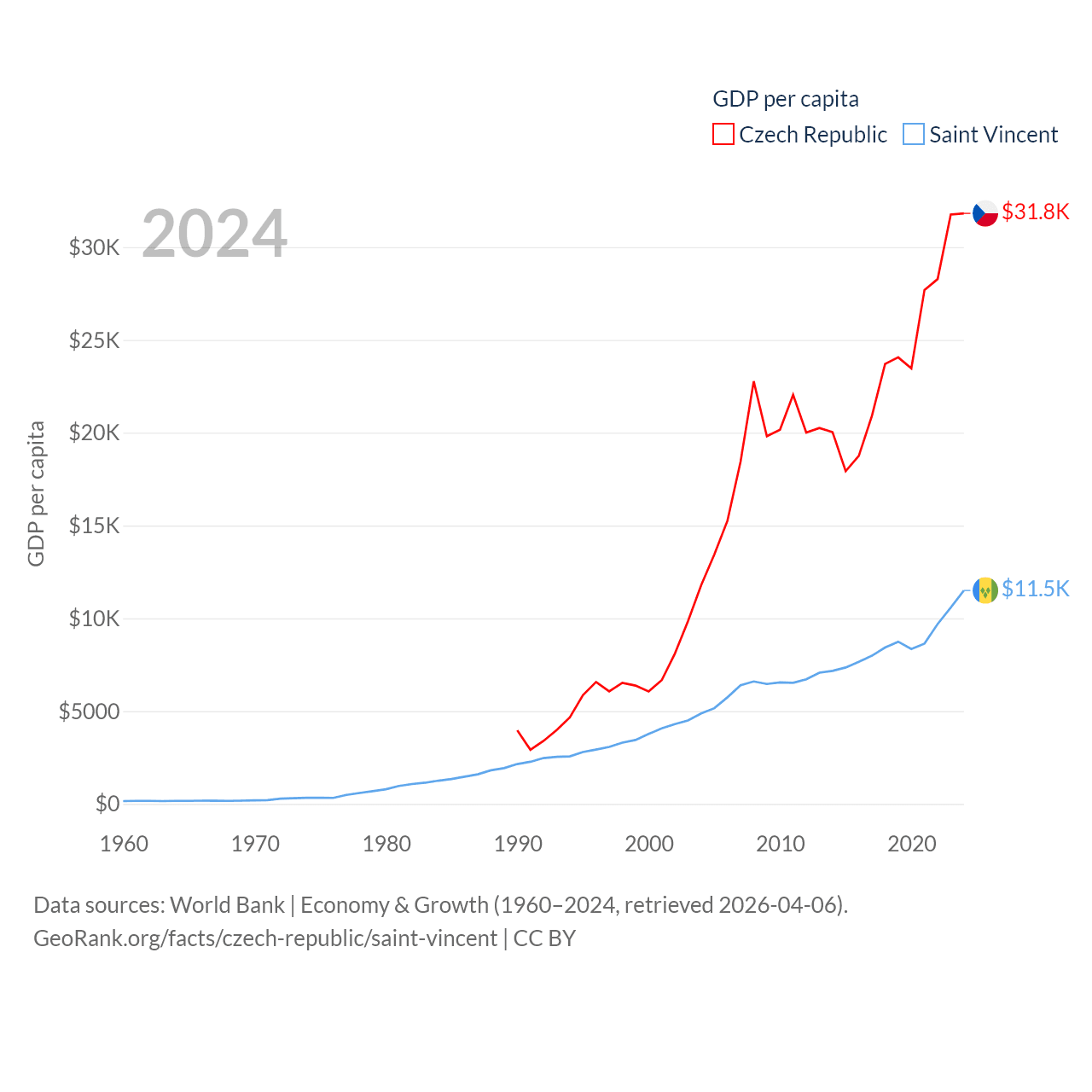 By GDP, The Czech Republic ranks 44/197 ($347B) and Saint Vincent ranks 186/197 ($1.16B). By GDP per capita, The Czech Republic ranks 39/197 ($31,823), while Saint Vincent ranks 81/197 ($11,501).