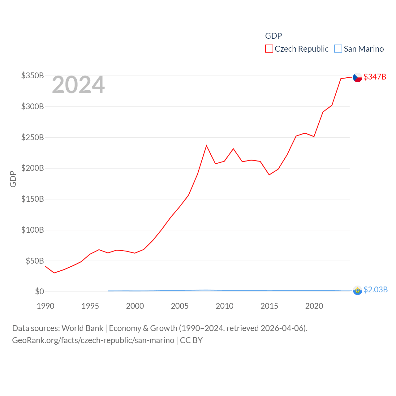 By GDP, The Czech Republic ranks 44/197 ($347B) and San Marino ranks 180/197 ($2.03B). By GDP per capita, The Czech Republic ranks 39/197 ($31,823), while San Marino ranks 15/197 ($59,880).