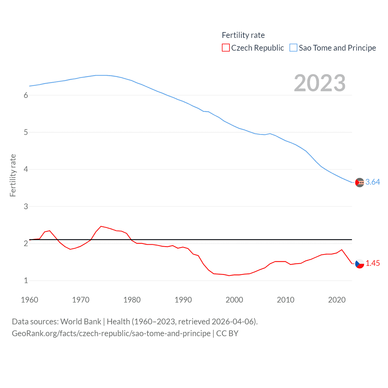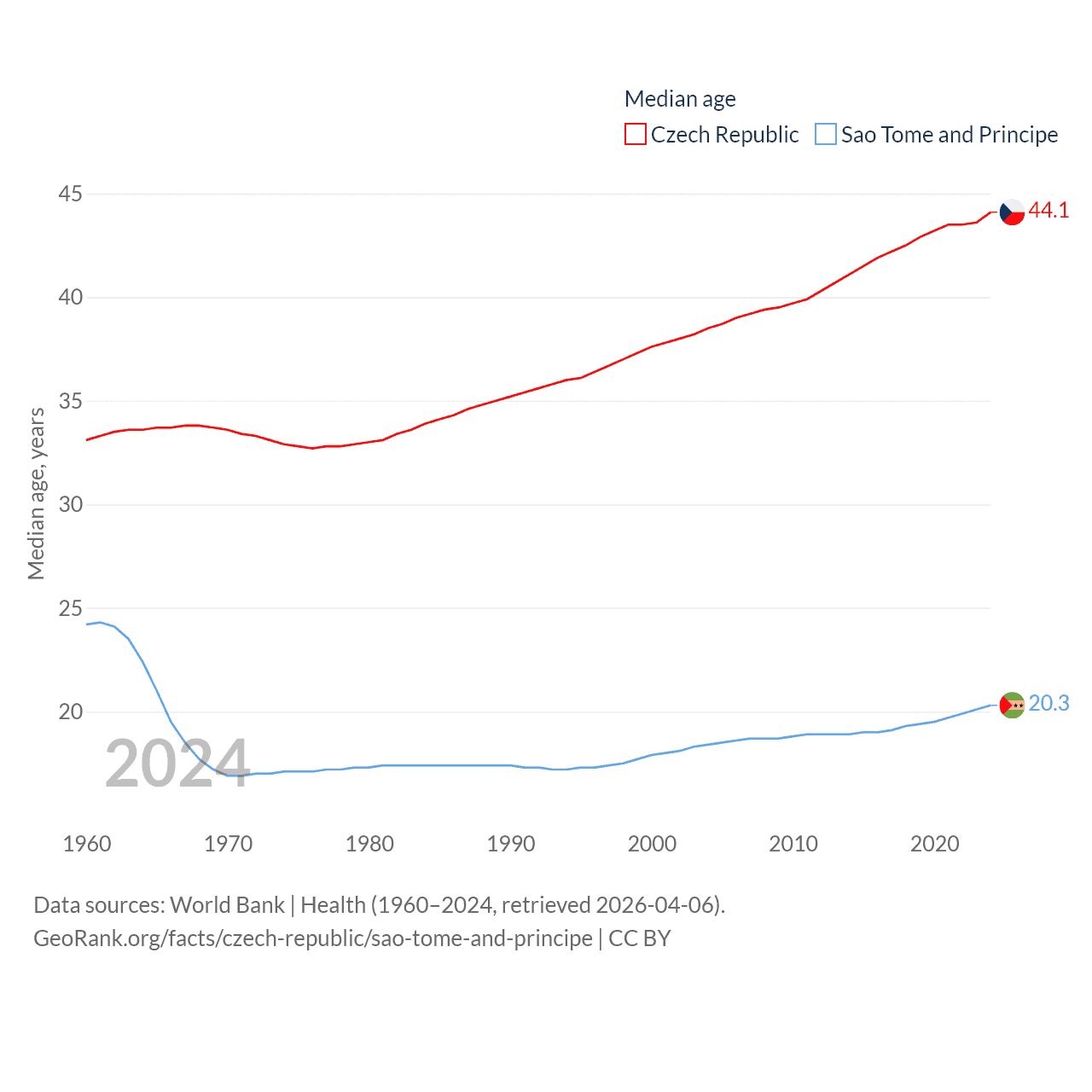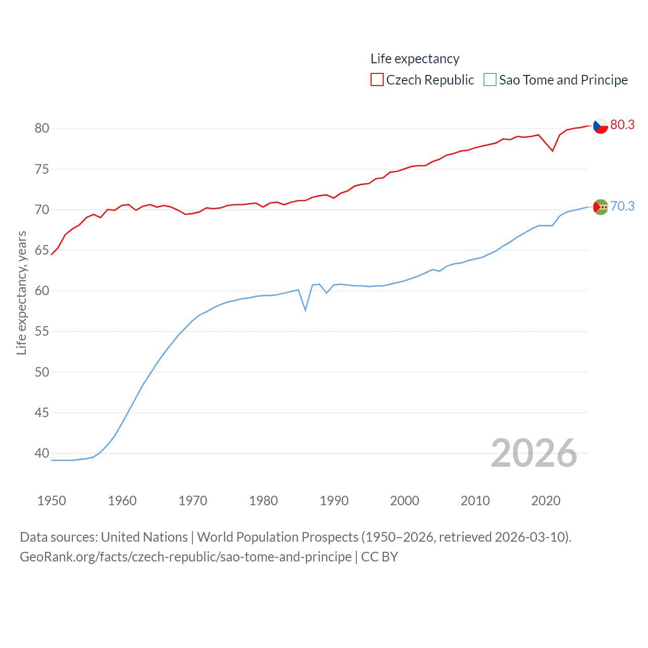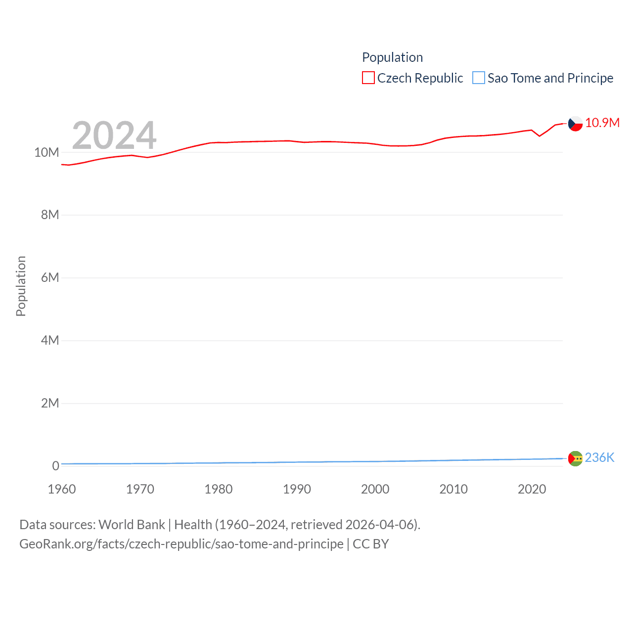 The Czech Republic has a population of 10.9M (ranked 88/197), compared with 236K in Sao Tome and Principe (ranked 176/197). The Czech Republic's land area is 29,794 sq mi versus 371 sq mi for Sao Tome and Principe (ranked 114th vs. 172nd).