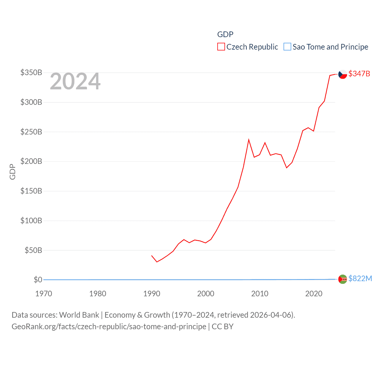 By GDP, The Czech Republic ranks 44/197 ($347B) and Sao Tome and Principe ranks 189/197 ($822M). By GDP per capita, The Czech Republic ranks 39/197 ($31,823), while Sao Tome and Principe ranks 134/197 ($3,491).