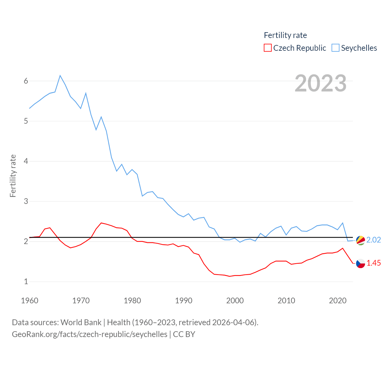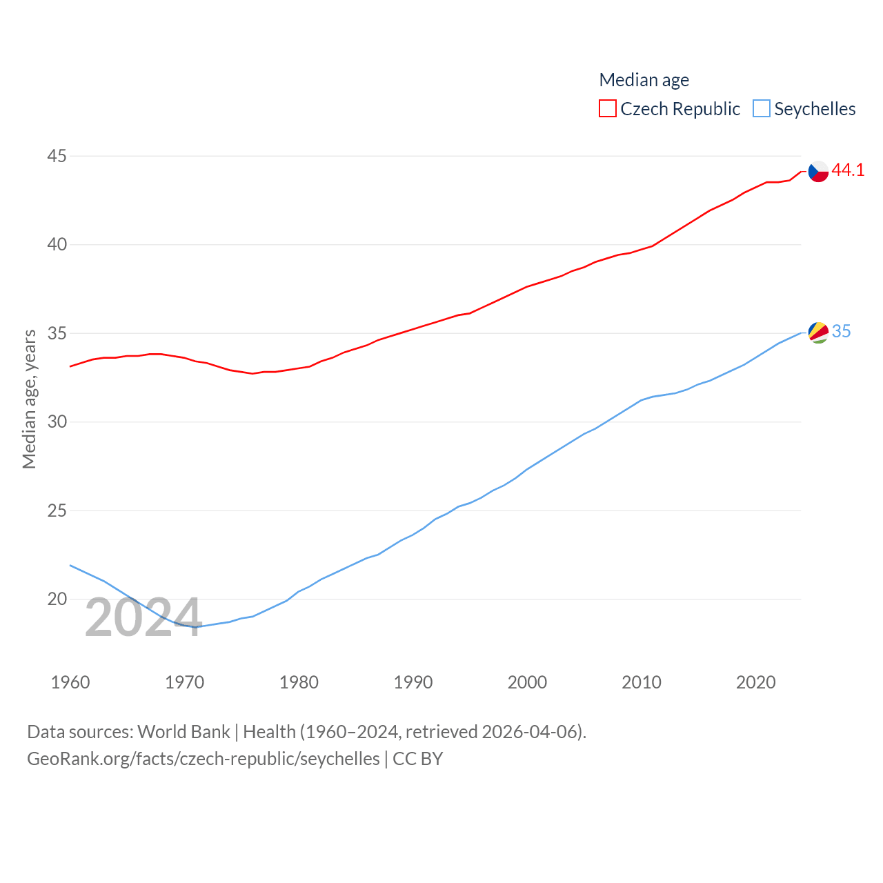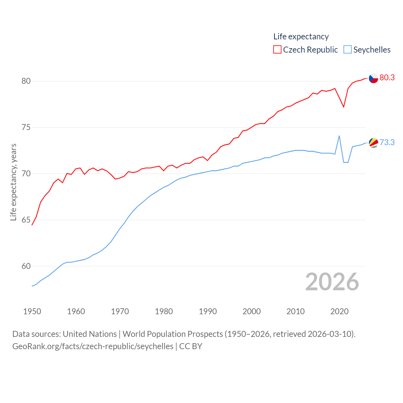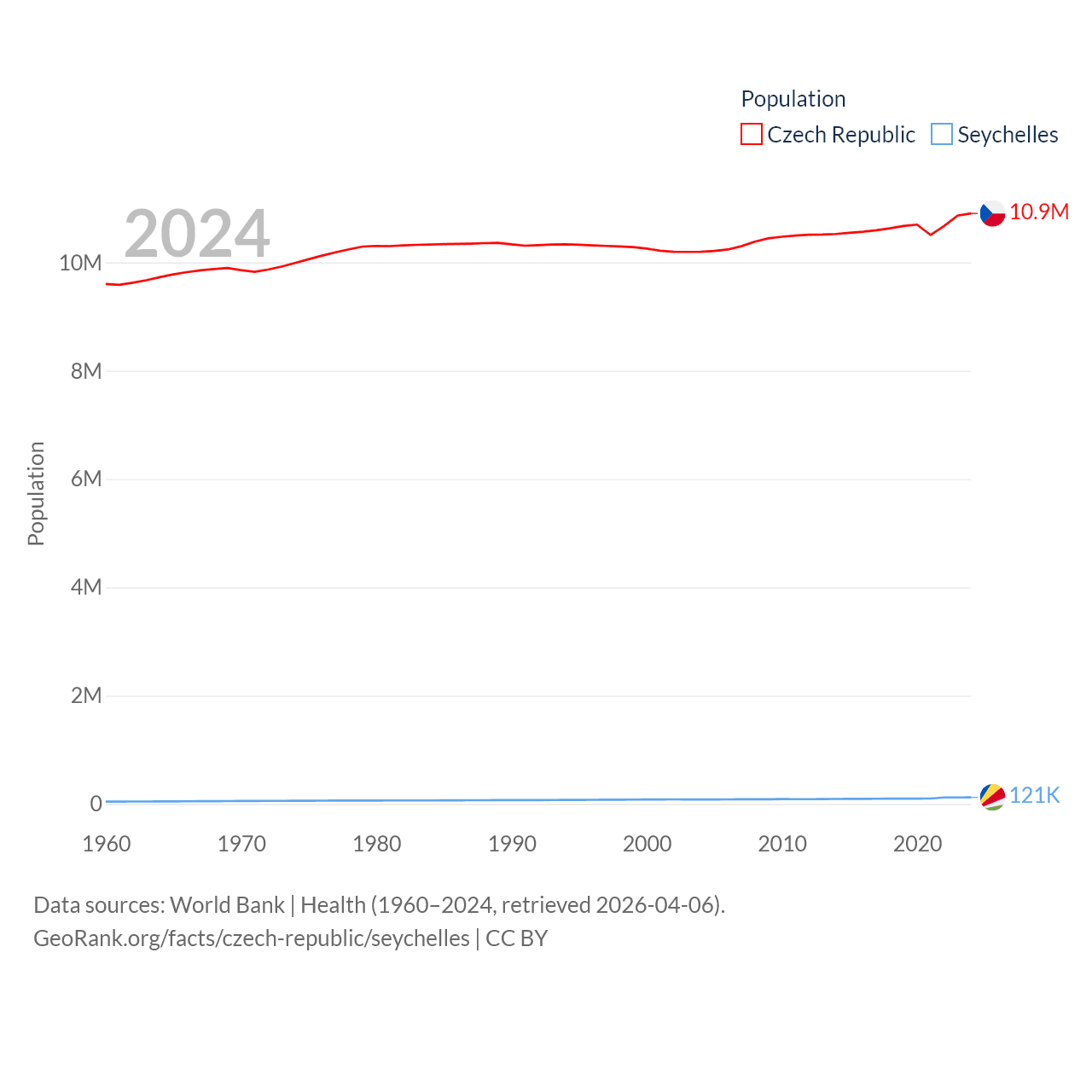 The Czech Republic has a population of 10.9M (ranked 88/197), compared with 121K in The Seychelles (ranked 181/197). The Czech Republic's land area is 29,794 sq mi versus 177.6 sq mi for The Seychelles (ranked 114th vs. 181st).