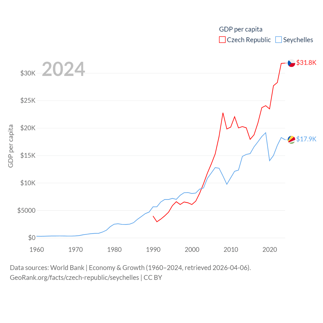 By GDP, The Czech Republic ranks 44/197 ($347B) and The Seychelles ranks 178/197 ($2.17B). By GDP per capita, The Czech Republic ranks 39/197 ($31,823), while The Seychelles ranks 63/197 ($17,859).