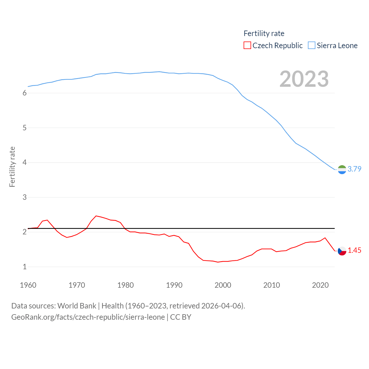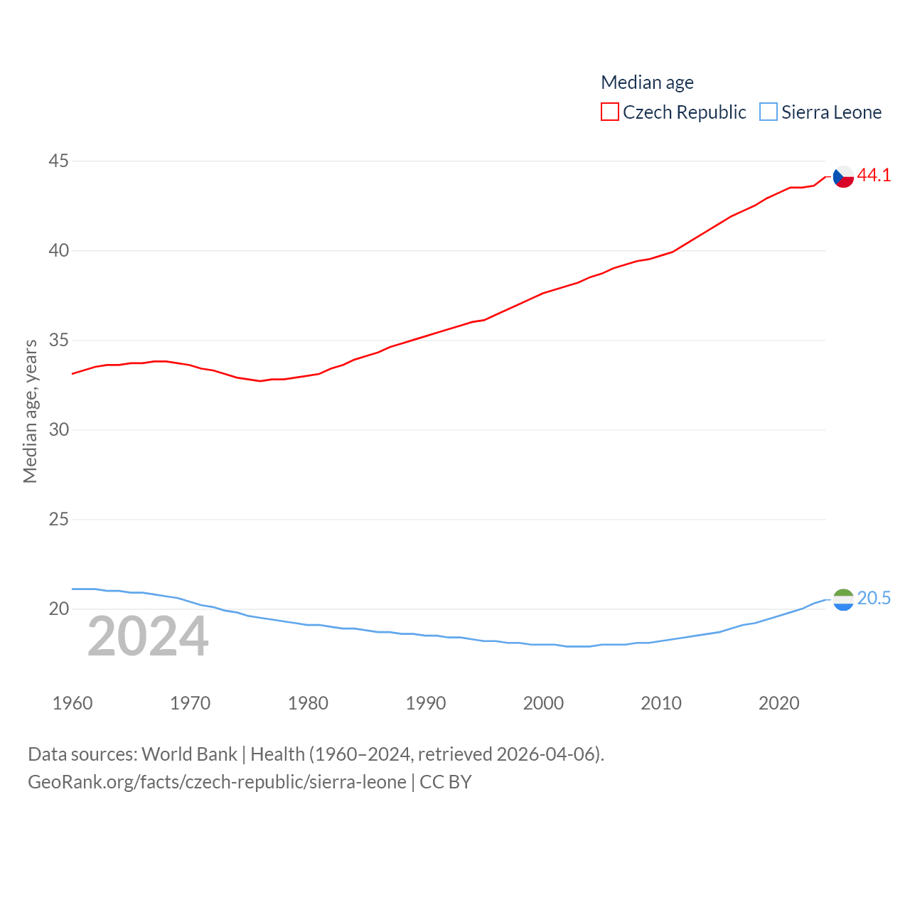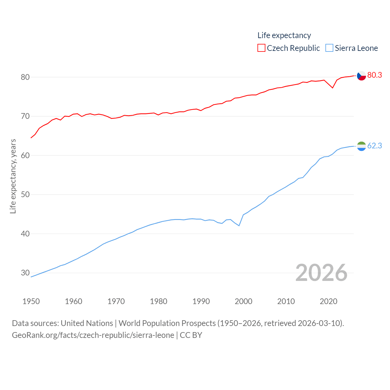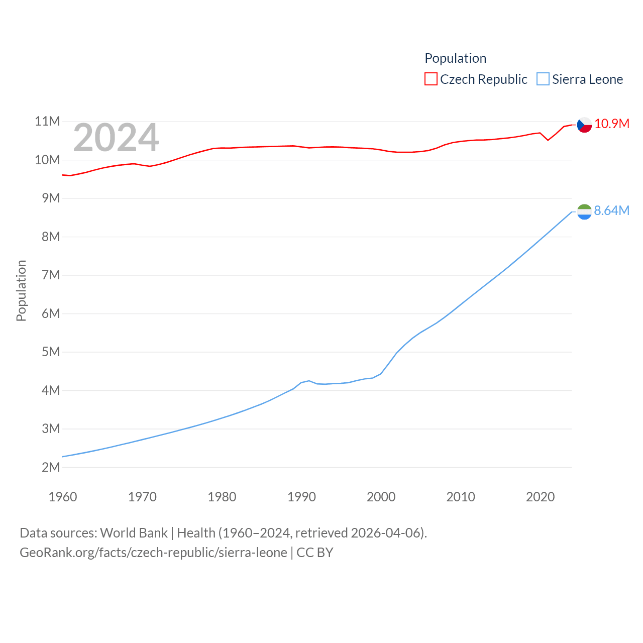 The Czech Republic has a population of 10.9M (ranked 88/197), compared with 8.64M in Sierra Leone (ranked 102/197). The Czech Republic's land area is 29,794 sq mi versus 27,869 sq mi for Sierra Leone (ranked 114th vs. 116th).