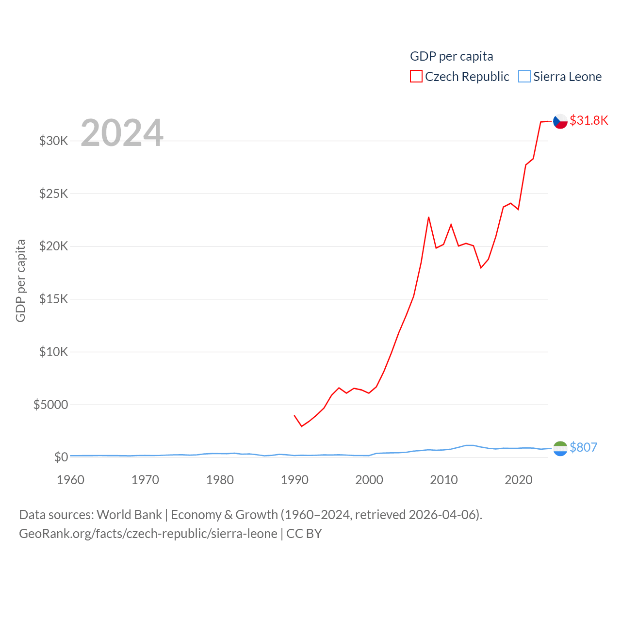 By GDP, The Czech Republic ranks 44/197 ($347B) and Sierra Leone ranks 160/197 ($6.97B). By GDP per capita, The Czech Republic ranks 39/197 ($31,823), while Sierra Leone ranks 186/197 ($807).