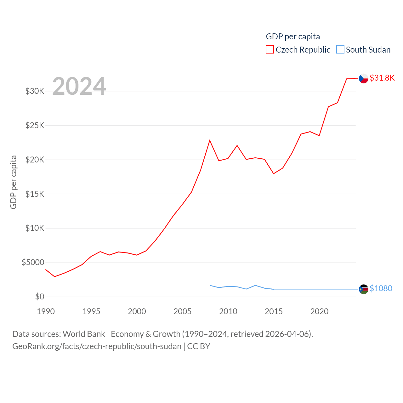 By GDP, The Czech Republic ranks 44/197 ($347B) and South Sudan ranks 149/197 ($12B). By GDP per capita, The Czech Republic ranks 39/197 ($31,823), while South Sudan ranks 175/197 ($1,080).