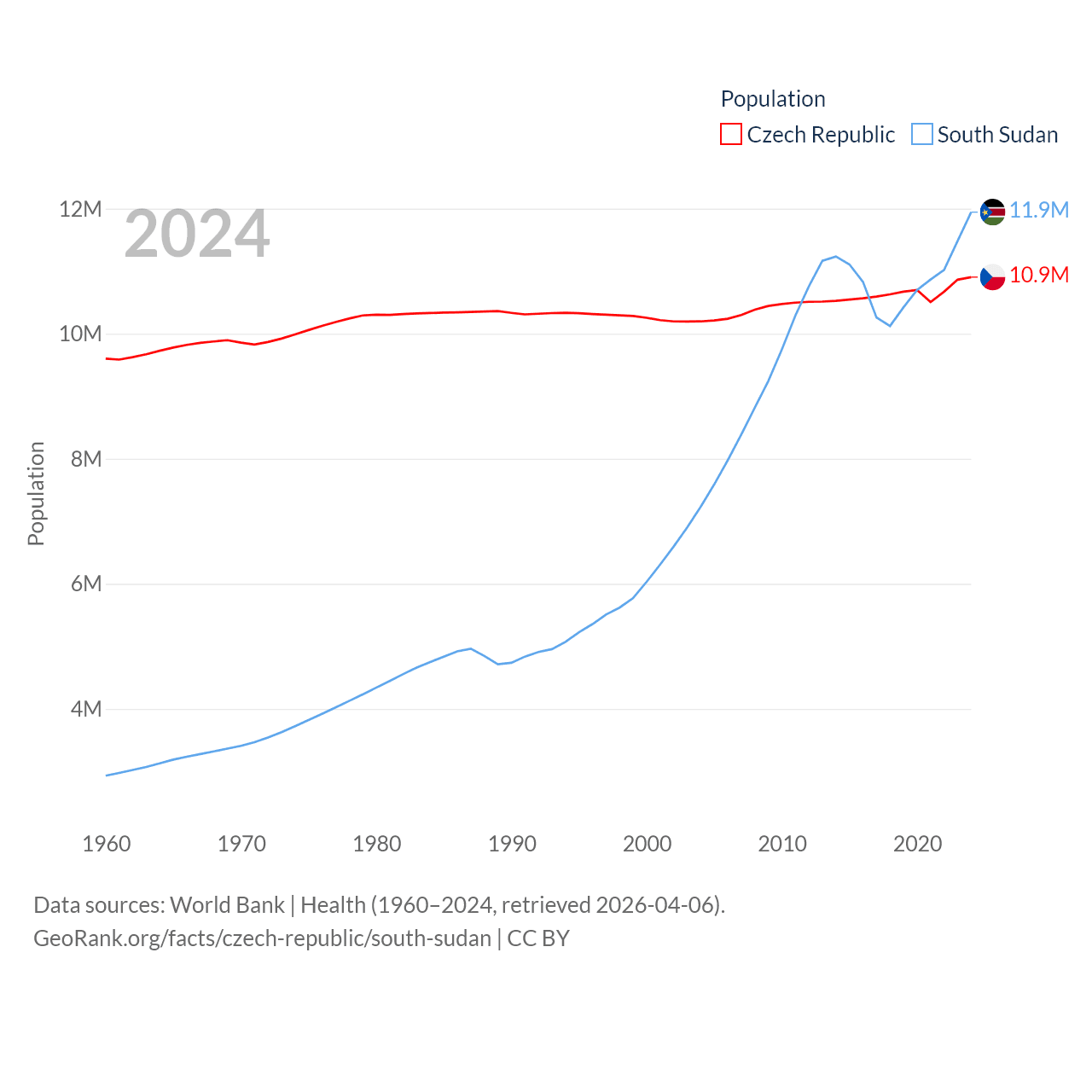 The Czech Republic has a population of 10.9M (ranked 88/197), compared with 11.9M in South Sudan (ranked 81/197). The Czech Republic's land area is 29,794 sq mi versus 243,990 sq mi for South Sudan (ranked 114th vs. 41st).