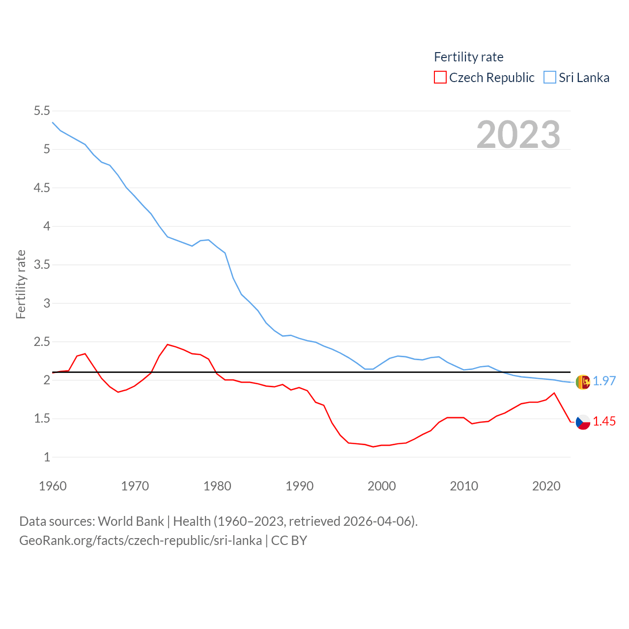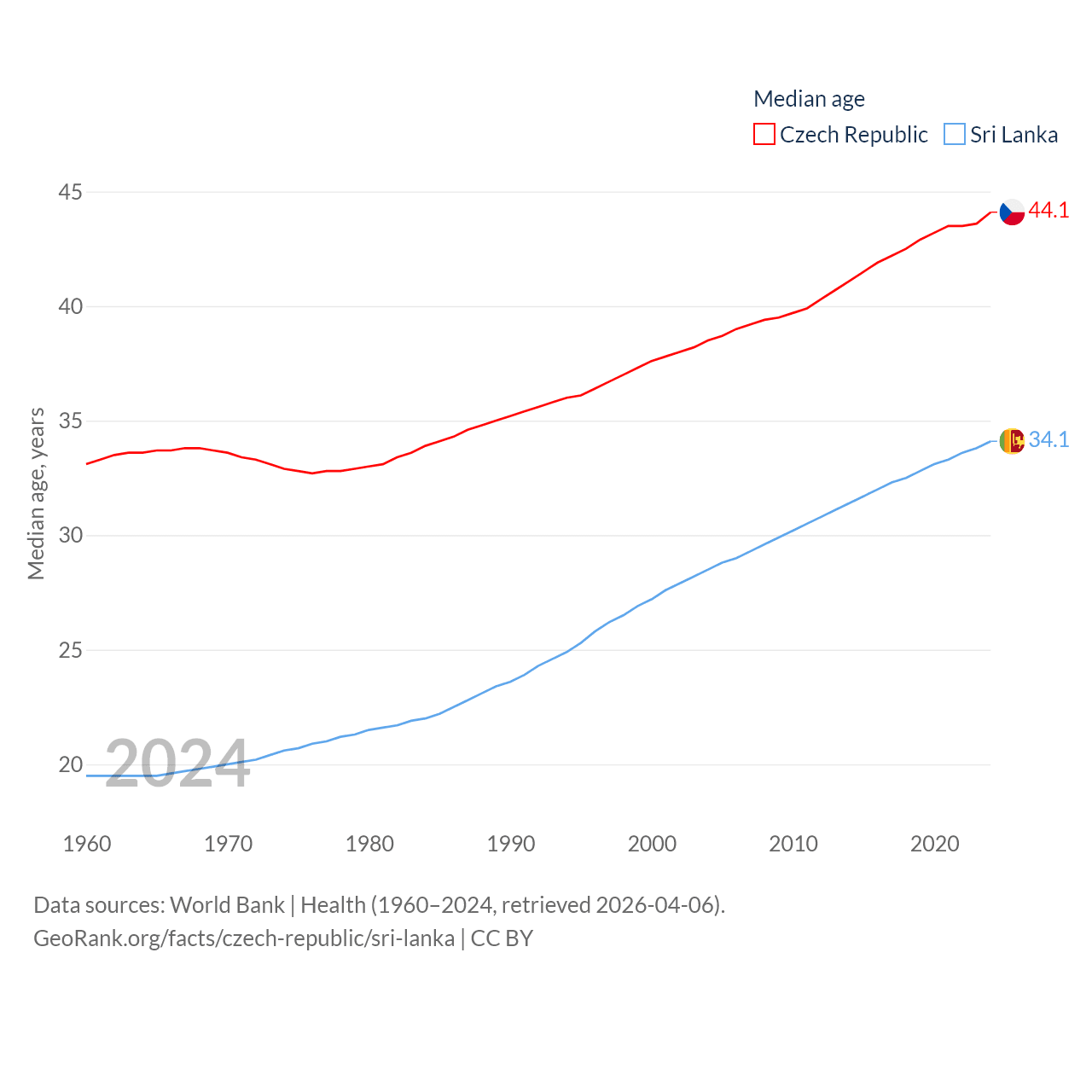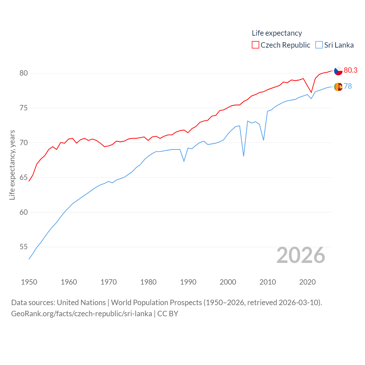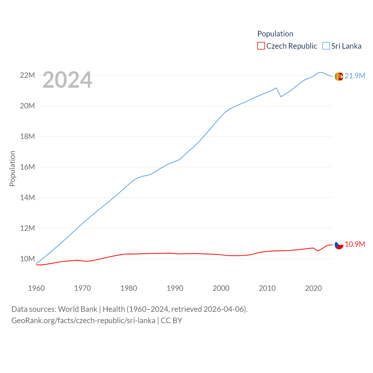 The Czech Republic has a population of 10.9M (ranked 88/197), compared with 21.9M in Sri Lanka (ranked 61/197). The Czech Republic's land area is 29,794 sq mi versus 23,884 sq mi for Sri Lanka (ranked 114th vs. 122nd).