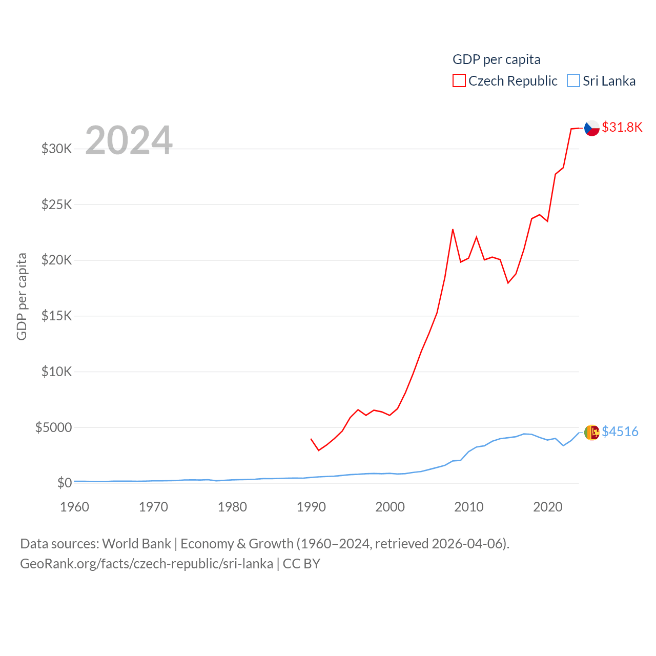 By GDP, The Czech Republic ranks 44/197 ($347B) and Sri Lanka ranks 72/197 ($99B). By GDP per capita, The Czech Republic ranks 39/197 ($31,823), while Sri Lanka ranks 124/197 ($4,516).