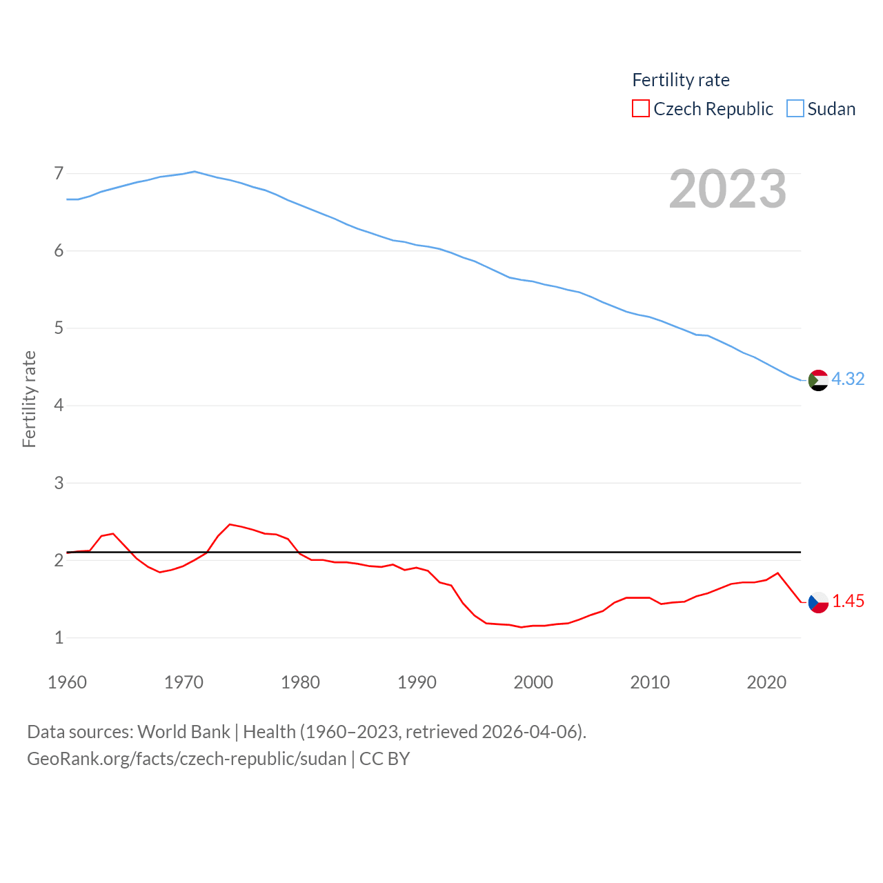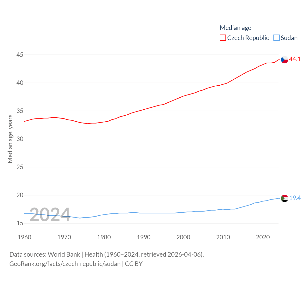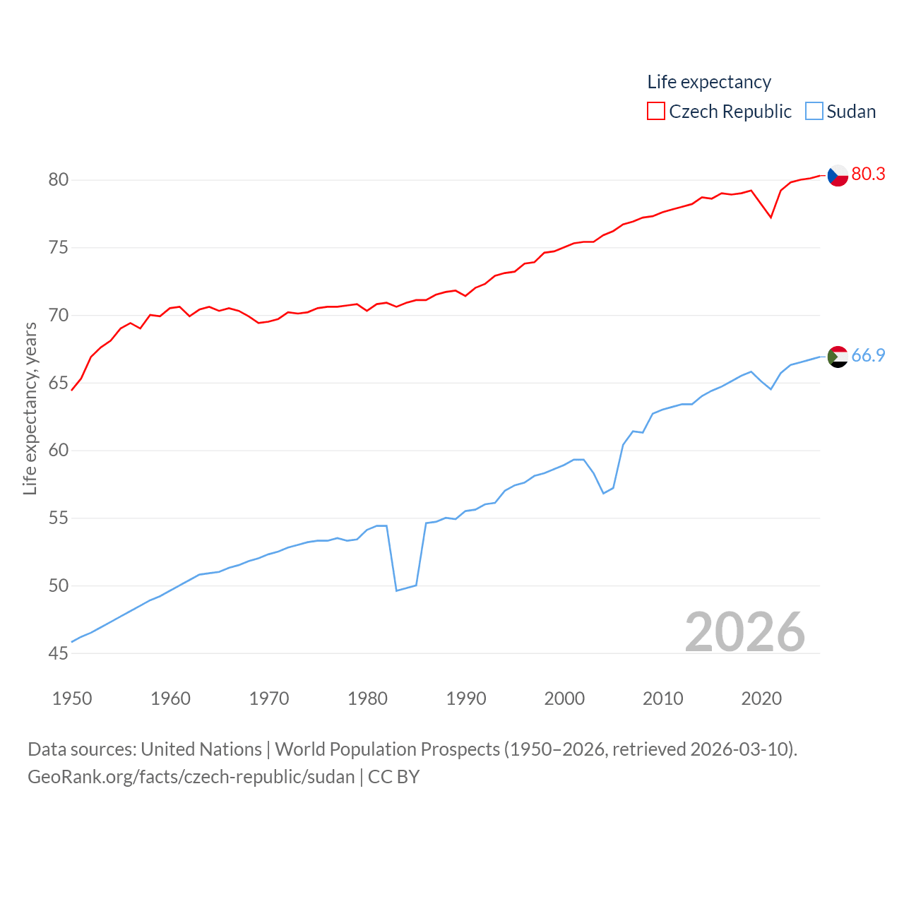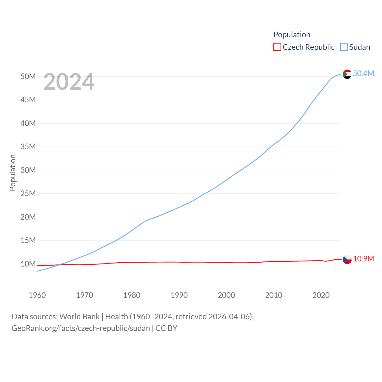 The Czech Republic has a population of 10.9M (ranked 88/197), compared with 50.4M in Sudan (ranked 30/197). The Czech Republic's land area is 29,794 sq mi versus 721,239 sq mi for Sudan (ranked 114th vs. 15th).