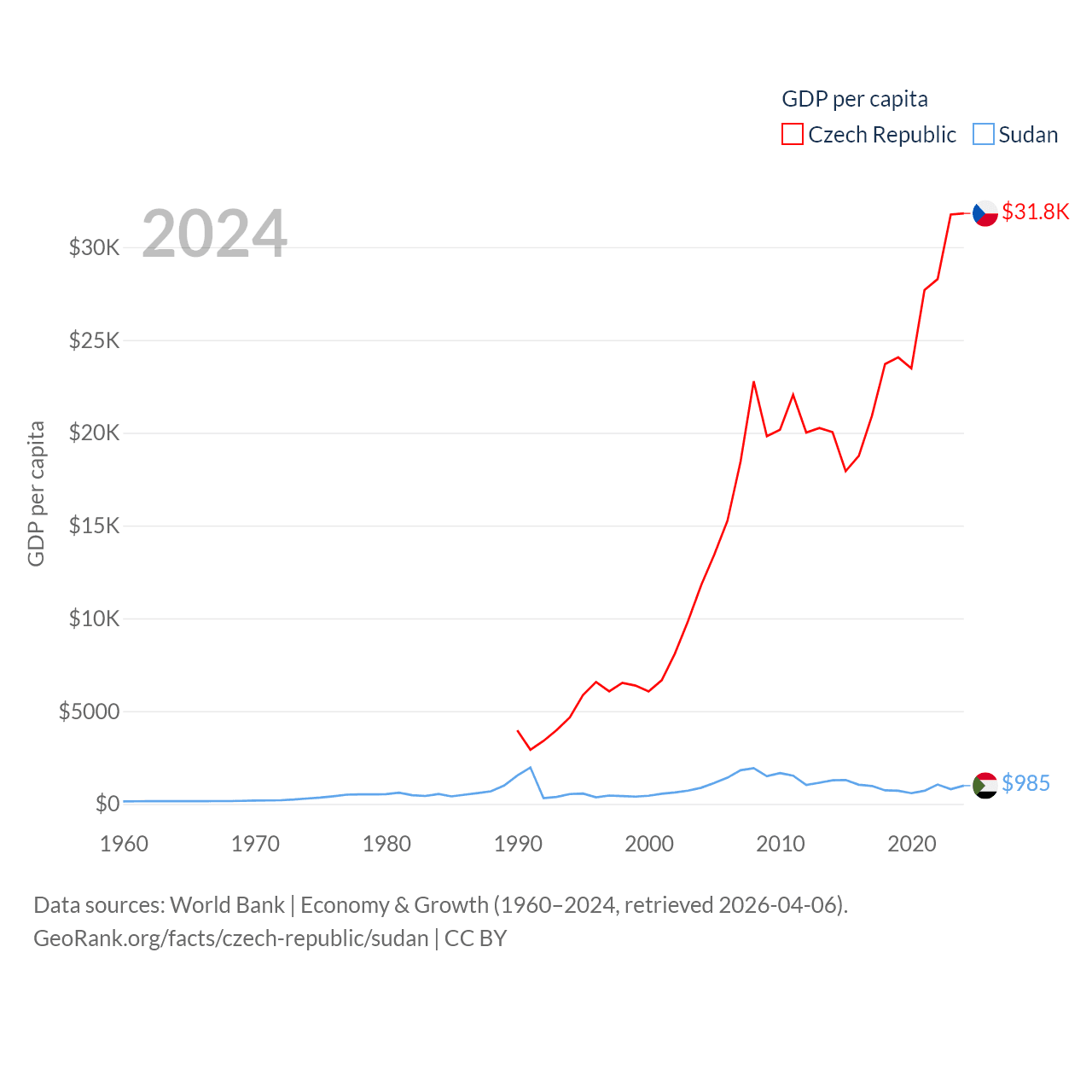 By GDP, The Czech Republic ranks 44/197 ($347B) and Sudan ranks 94/197 ($49.7B). By GDP per capita, The Czech Republic ranks 39/197 ($31,823), while Sudan ranks 179/197 ($985).