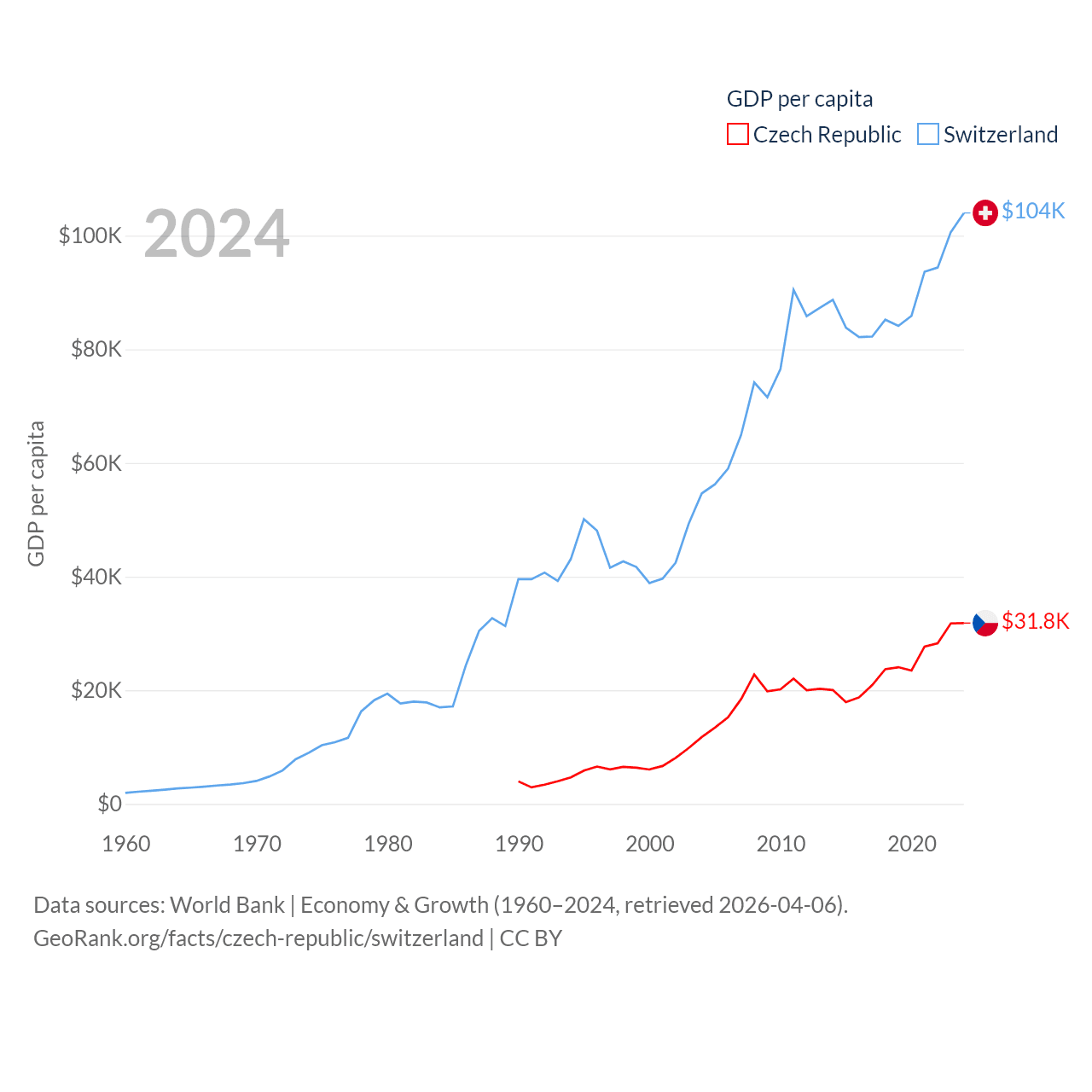 By GDP, The Czech Republic ranks 44/197 ($347B) and Switzerland ranks 20/197 ($937B). By GDP per capita, The Czech Republic ranks 39/197 ($31,823), while Switzerland ranks 5/197 ($103,998).