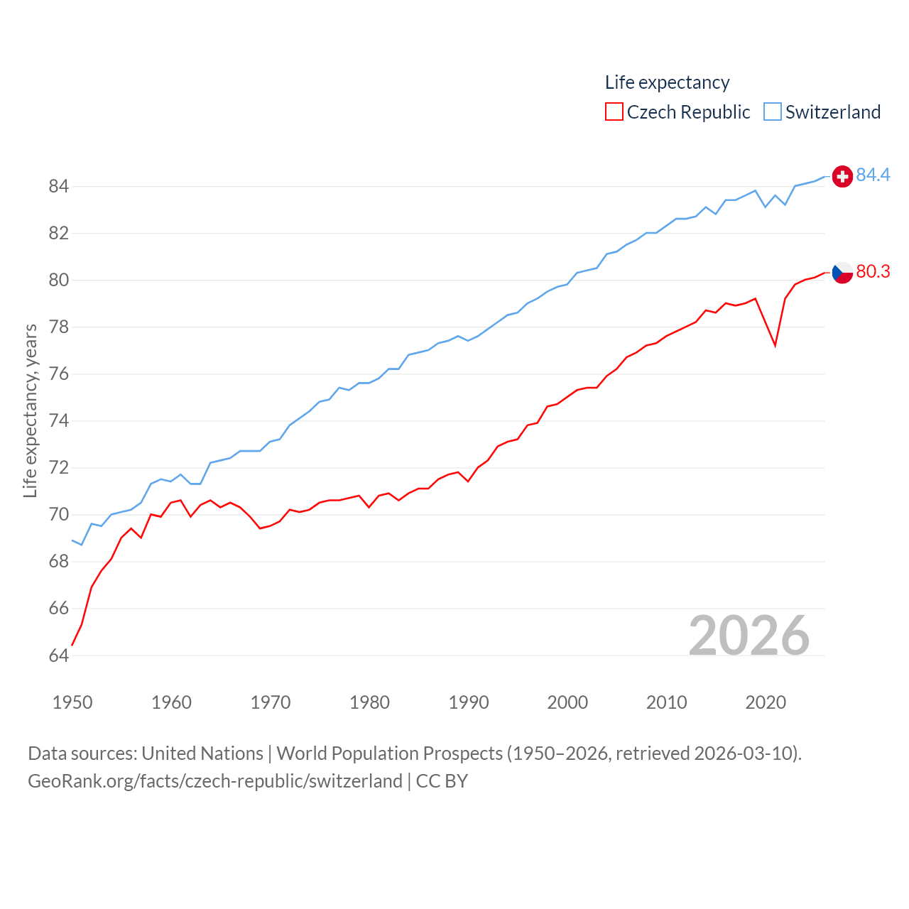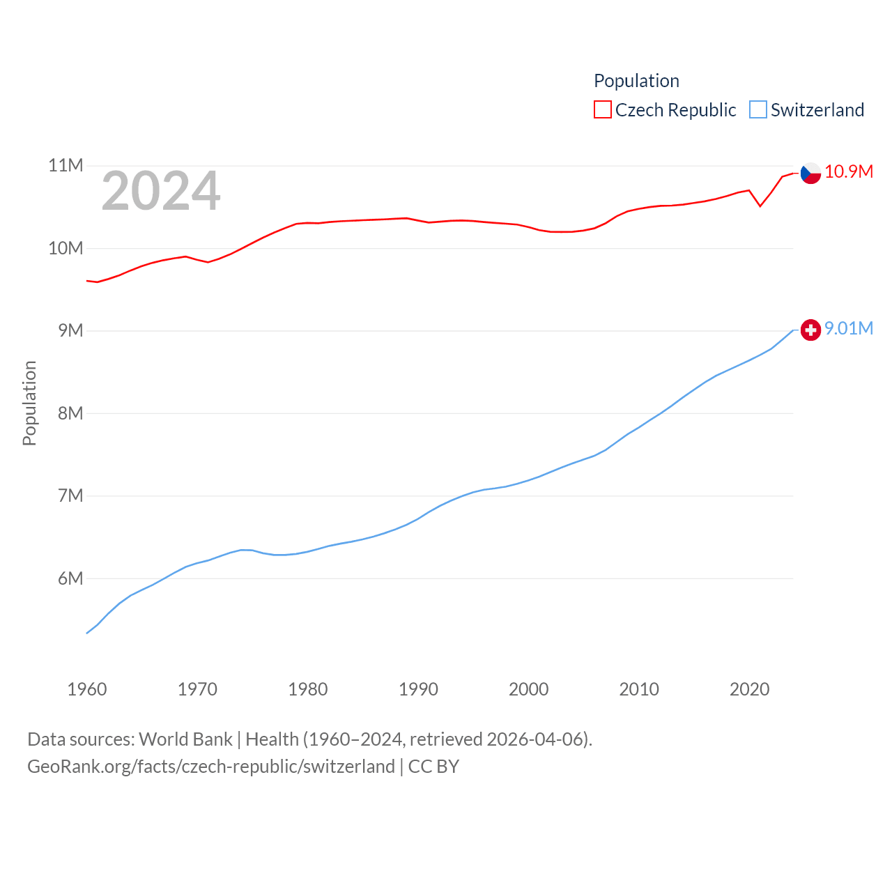 The Czech Republic has a population of 10.9M (ranked 88/197), compared with 9.01M in Switzerland (ranked 101/197). The Czech Republic's land area is 29,794 sq mi versus 15,255 sq mi for Switzerland (ranked 114th vs. 131st).