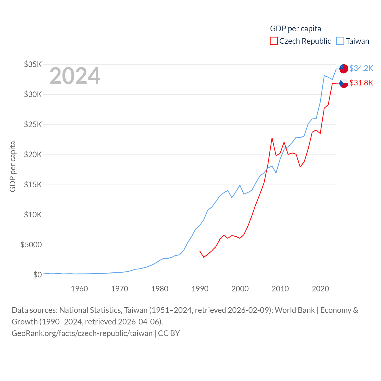 By GDP, The Czech Republic ranks 44/197 ($347B) and Taiwan ranks 22/197 ($802B). By GDP per capita, The Czech Republic ranks 39/197 ($31,823), while Taiwan ranks 35/197 ($34,238).