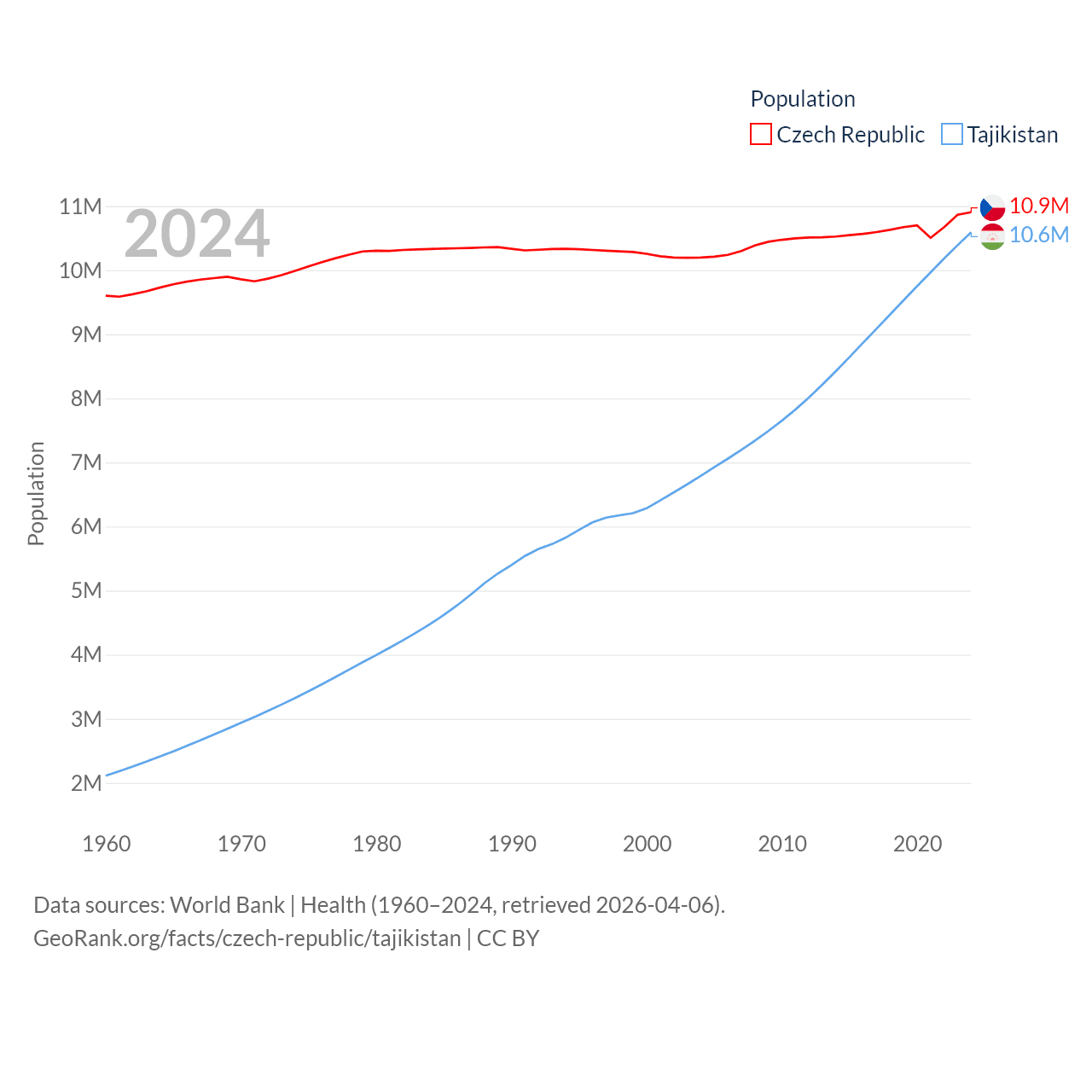 The Czech Republic has a population of 10.9M (ranked 88/197), compared with 10.6M in Tajikistan (ranked 91/197). The Czech Republic's land area is 29,794 sq mi versus 53,587 sq mi for Tajikistan (ranked 114th vs. 93rd).