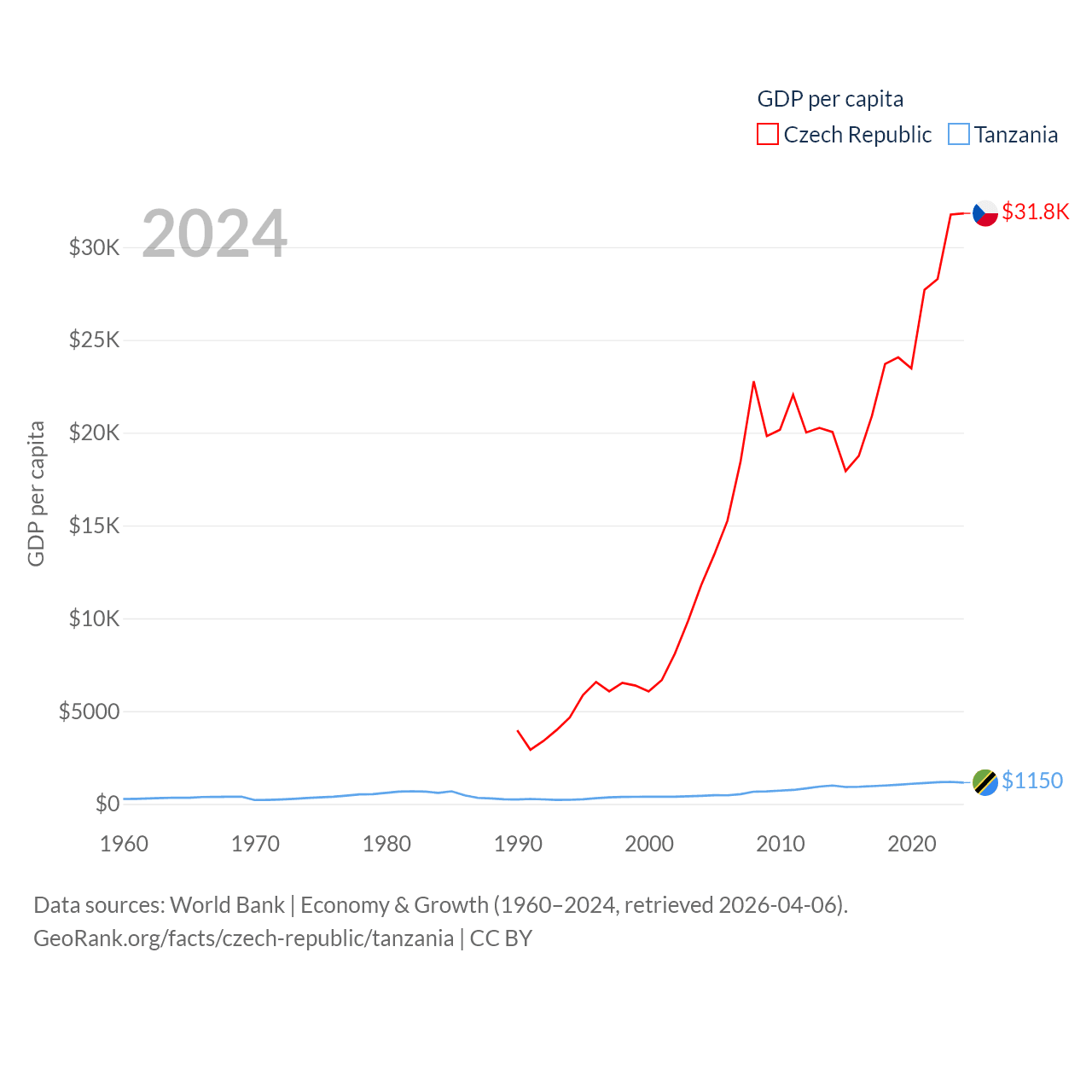 By GDP, The Czech Republic ranks 44/197 ($347B) and Tanzania ranks 82/197 ($78.8B). By GDP per capita, The Czech Republic ranks 39/197 ($31,823), while Tanzania ranks 170/197 ($1,150).