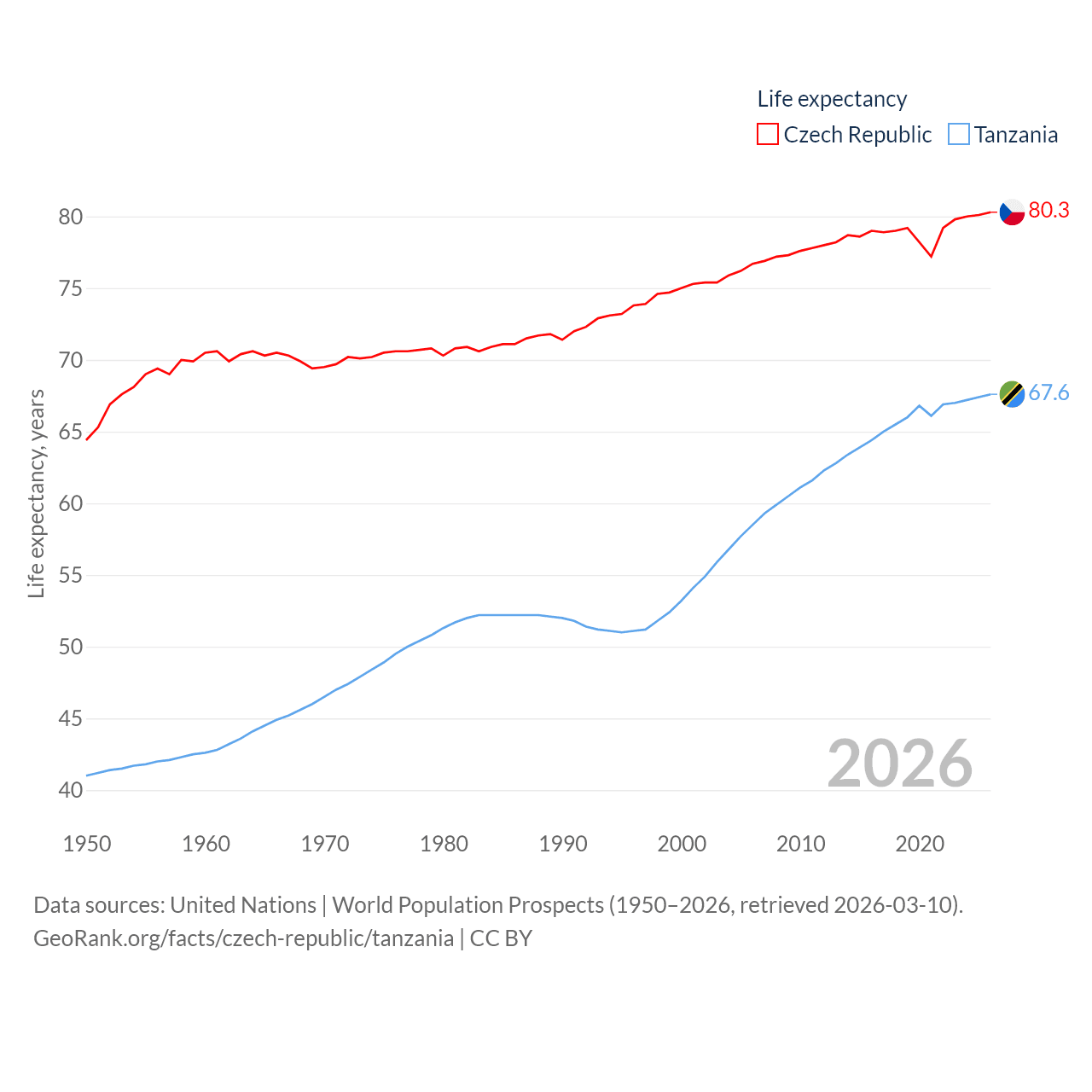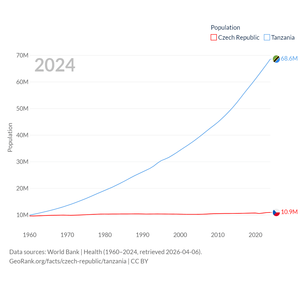 The Czech Republic has a population of 10.9M (ranked 88/197), compared with 68.6M in Tanzania (ranked 22/197). The Czech Republic's land area is 29,794 sq mi versus 342,009 sq mi for Tanzania (ranked 114th vs. 31st).