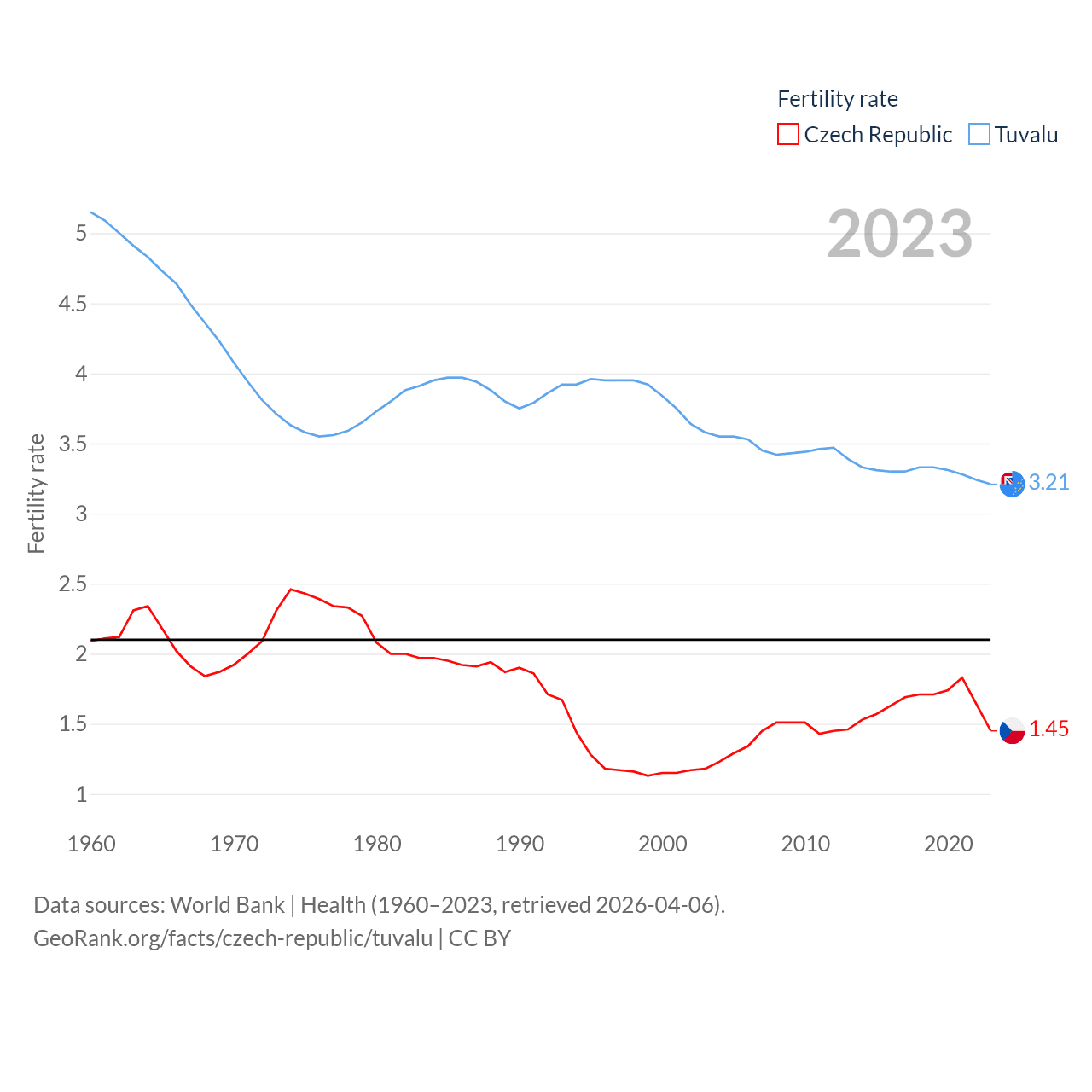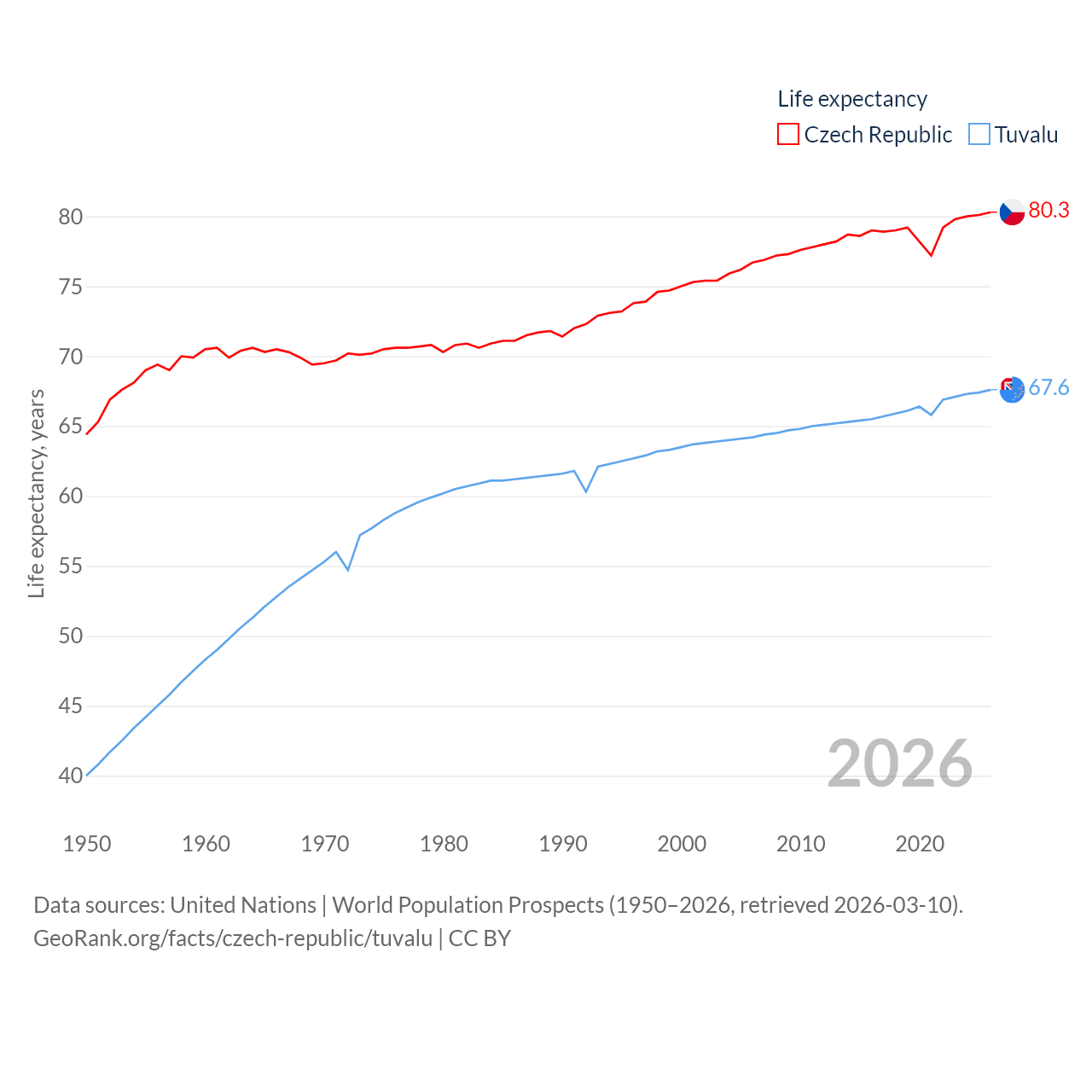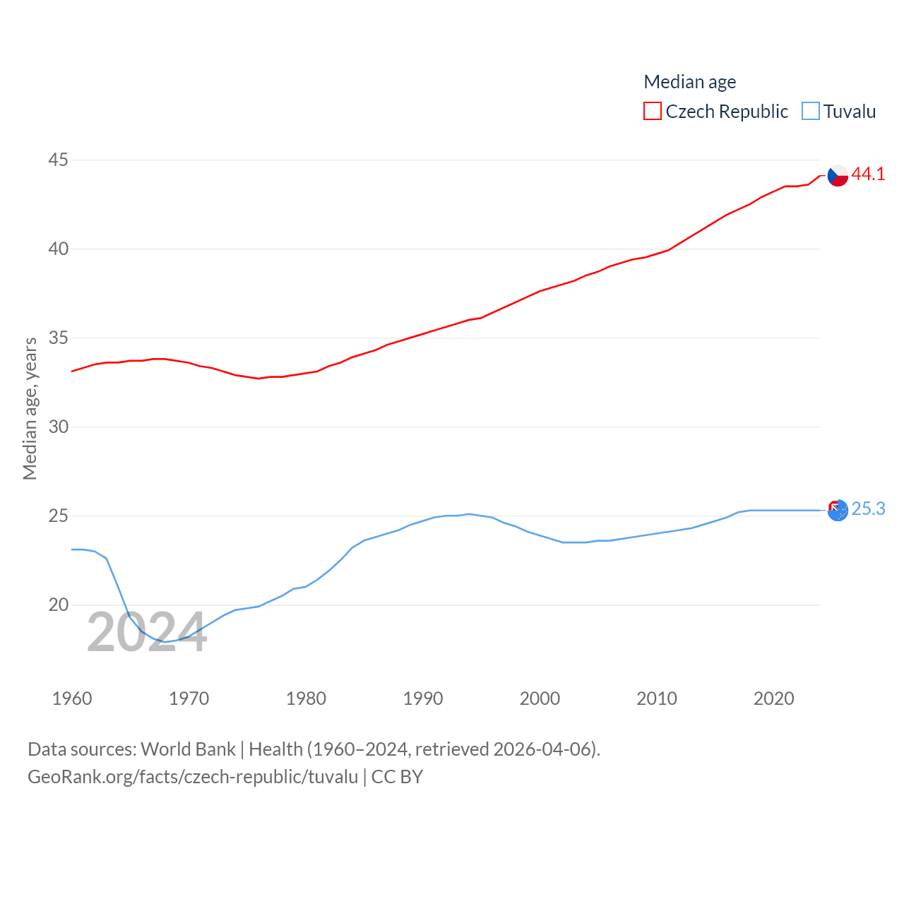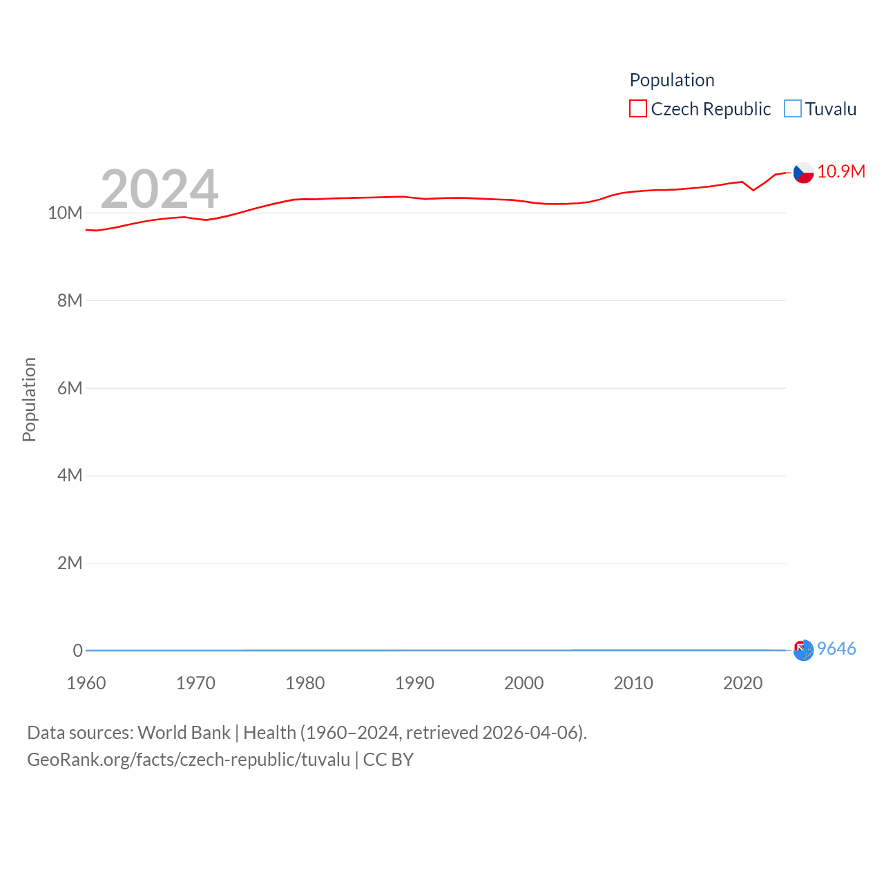 The Czech Republic has a population of 10.9M (ranked 88/197), compared with 9.65K in Tuvalu (ranked 196/197). The Czech Republic's land area is 29,794 sq mi versus 11.6 sq mi for Tuvalu (ranked 114th vs. 194th).