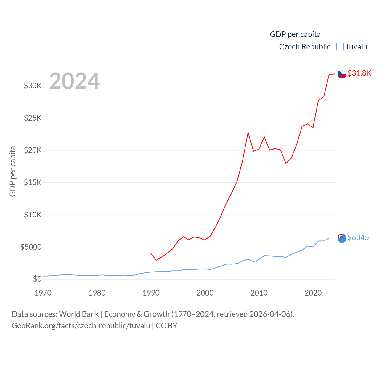 By GDP, The Czech Republic ranks 44/197 ($347B) and Tuvalu ranks 196/197 ($62.3M). By GDP per capita, The Czech Republic ranks 39/197 ($31,823), while Tuvalu ranks 110/197 ($6,345).