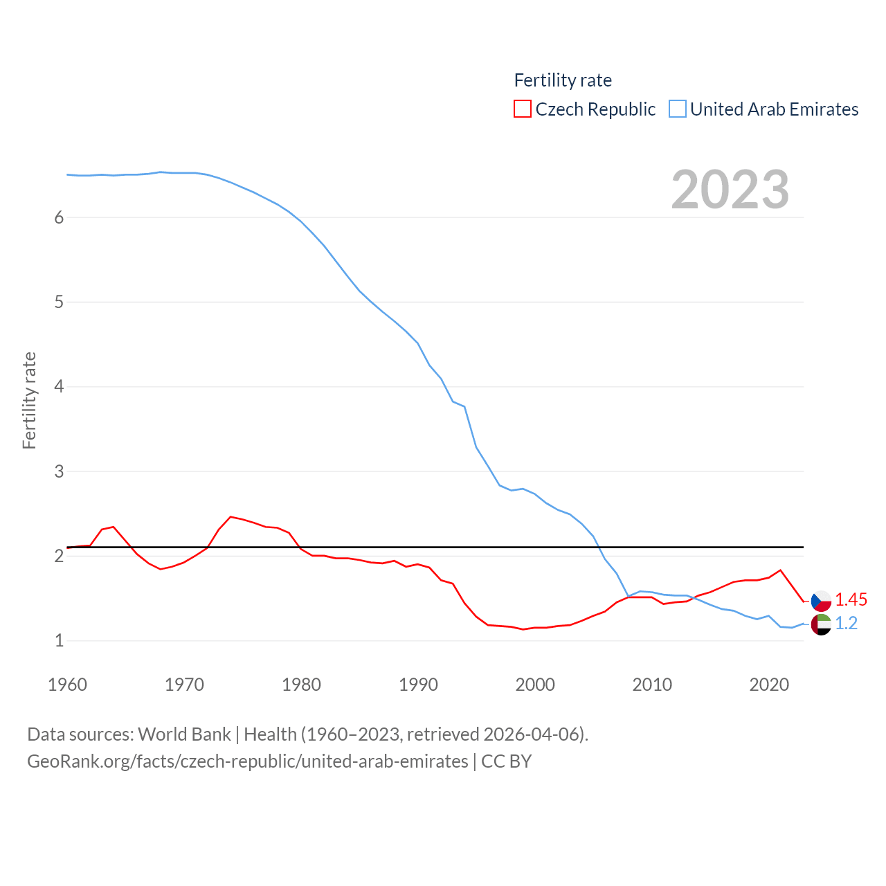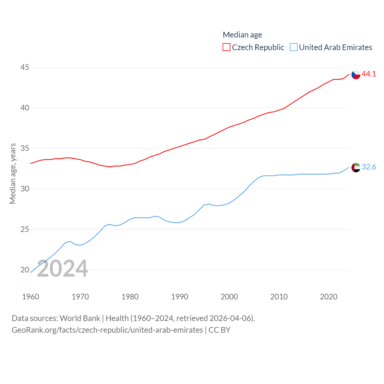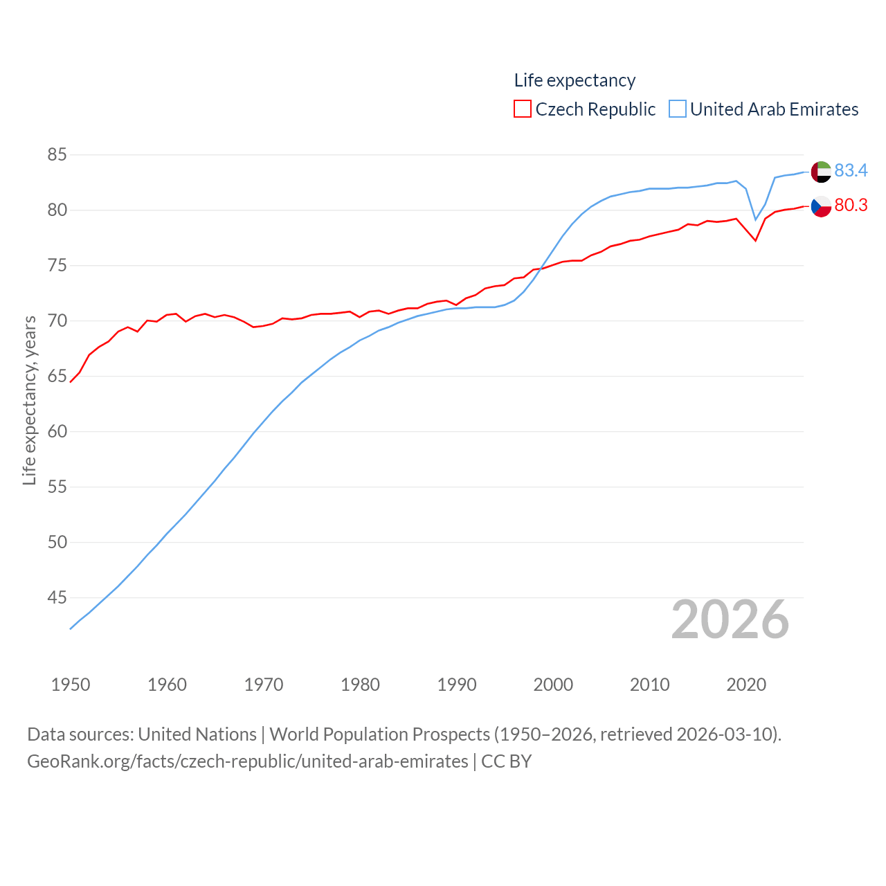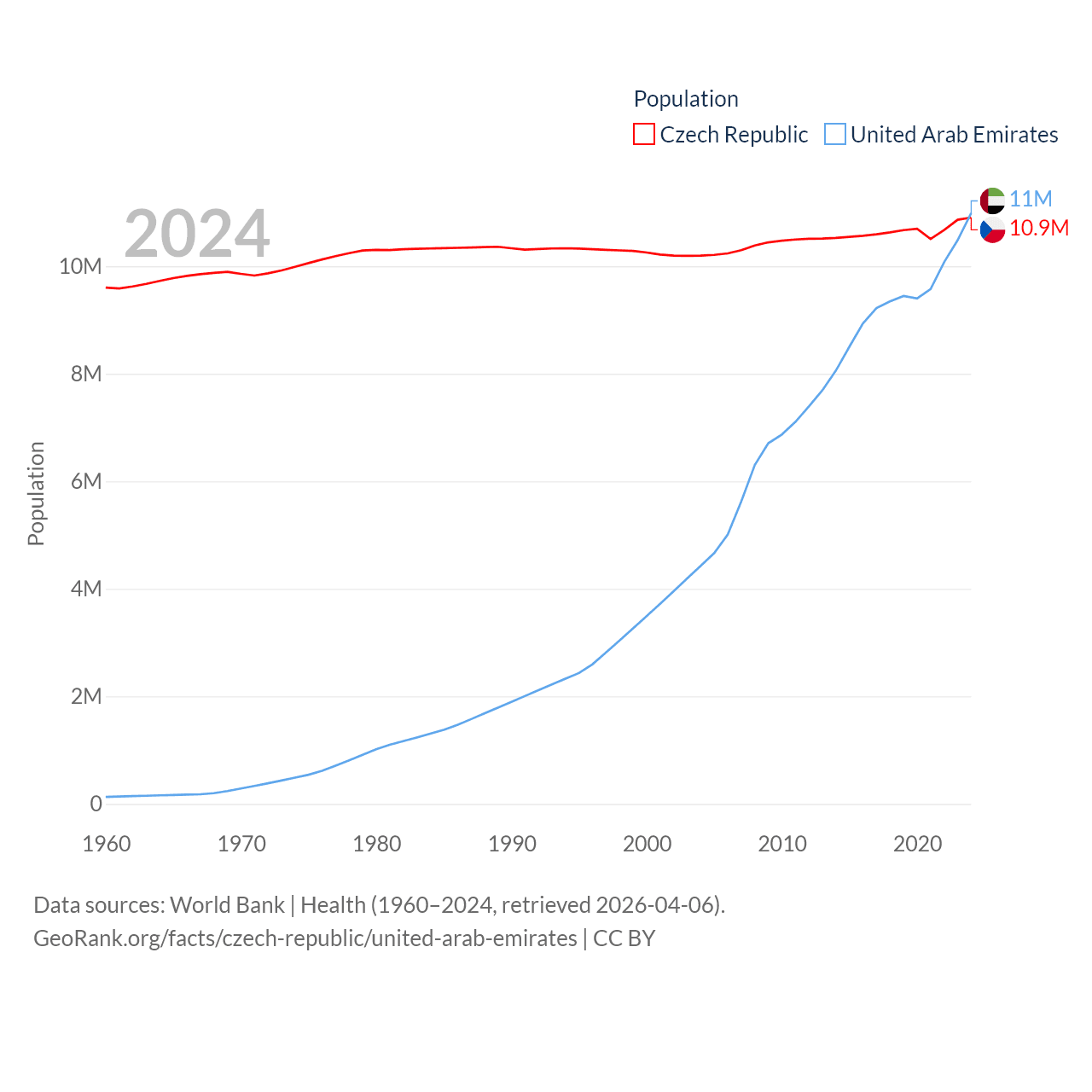 The Czech Republic has a population of 10.9M (ranked 88/197), compared with 11M in The United Arab Emirates (ranked 86/197). The Czech Republic's land area is 29,794 sq mi versus 27,421 sq mi for The United Arab Emirates (ranked 114th vs. 117th).
