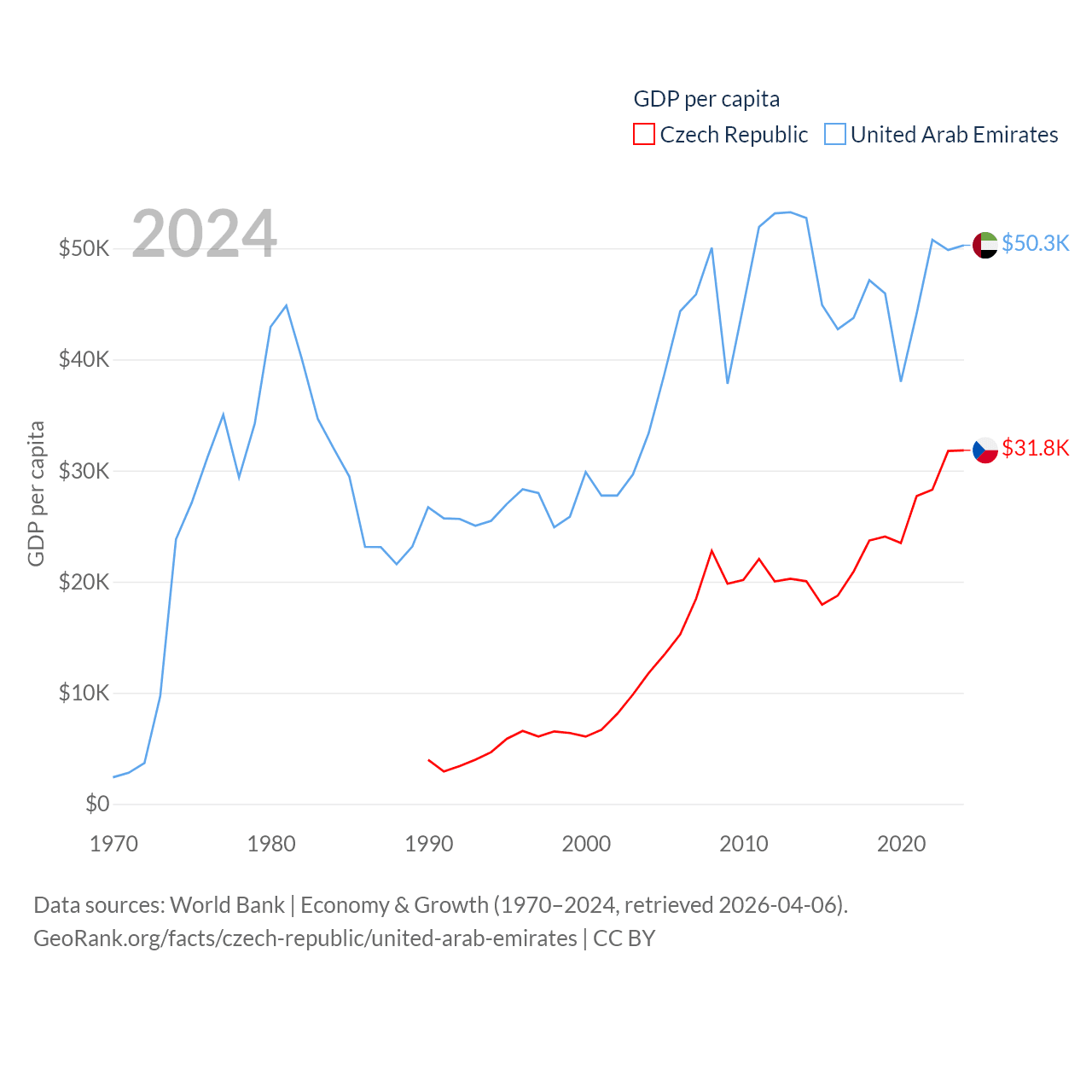 By GDP, The Czech Republic ranks 44/197 ($347B) and The United Arab Emirates ranks 27/197 ($552B). By GDP per capita, The Czech Republic ranks 39/197 ($31,823), while The United Arab Emirates ranks 24/197 ($50,274).