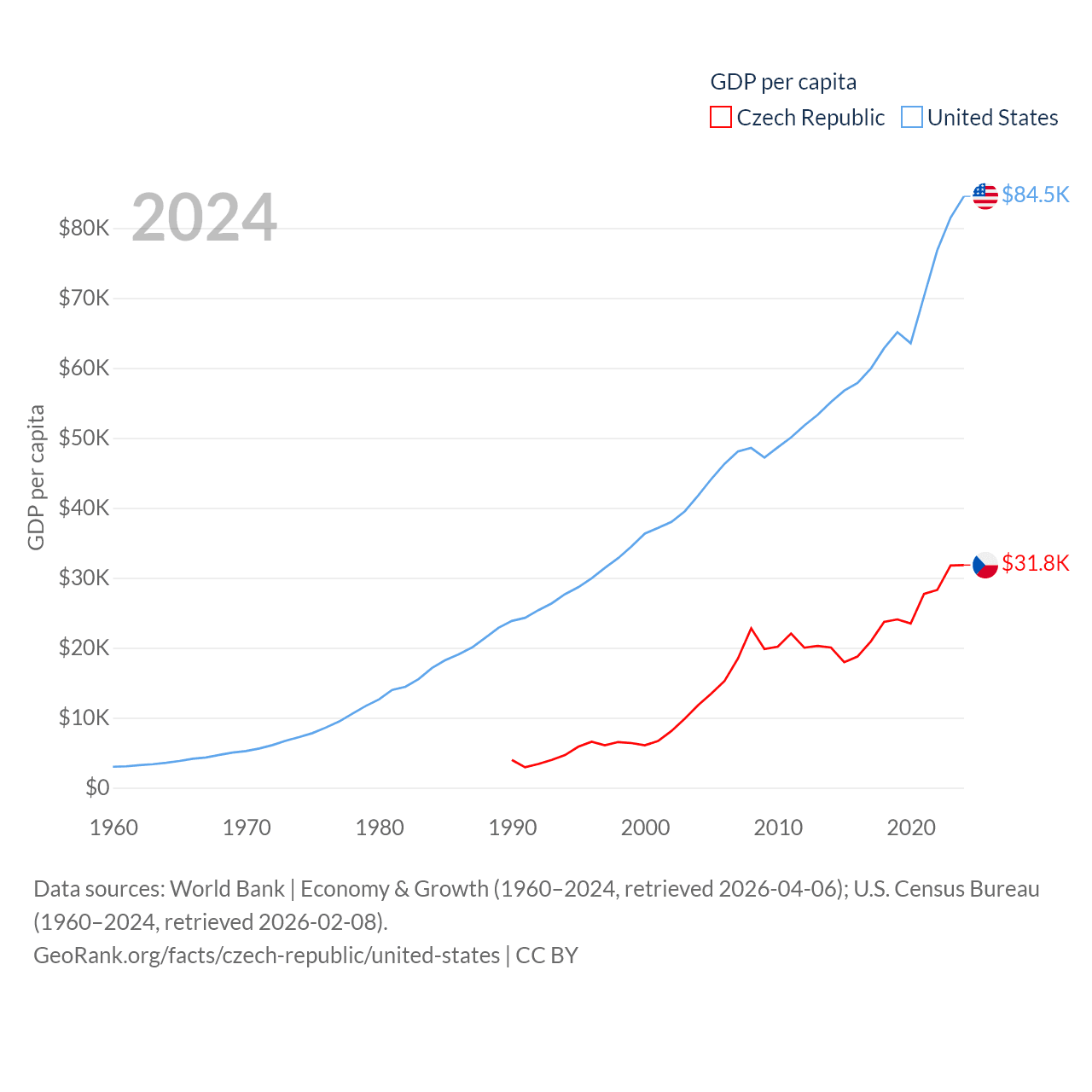 By GDP, The Czech Republic ranks 44/197 ($347B) and The United States ranks 1/197 ($28.8T). By GDP per capita, The Czech Republic ranks 39/197 ($31,823), while The United States ranks 10/197 ($84,534).