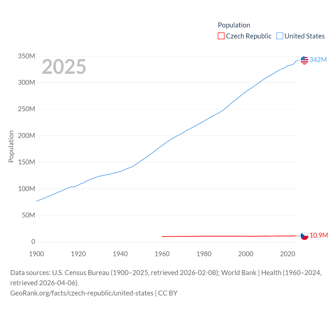 The Czech Republic has a population of 10.9M (ranked 88/197), compared with 342M in The United States (ranked 3/197). The Czech Republic's land area is 29,794 sq mi versus 3,531,839 sq mi for The United States (ranked 114th vs. 3rd).