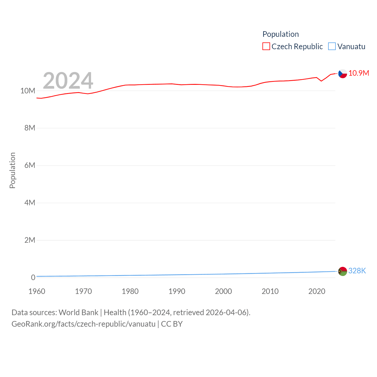 The Czech Republic has a population of 10.9M (ranked 88/197), compared with 328K in Vanuatu (ranked 174/197). The Czech Republic's land area is 29,794 sq mi versus 4,707 sq mi for Vanuatu (ranked 114th vs. 157th).