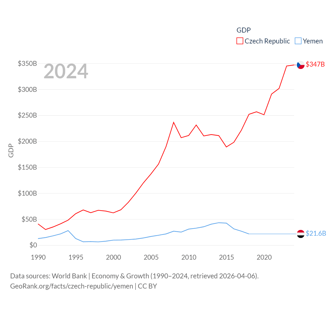By GDP, The Czech Republic ranks 44/197 ($347B) and Yemen ranks 125/197 ($21.6B). By GDP per capita, The Czech Republic ranks 39/197 ($31,823), while Yemen ranks 191/197 ($634).