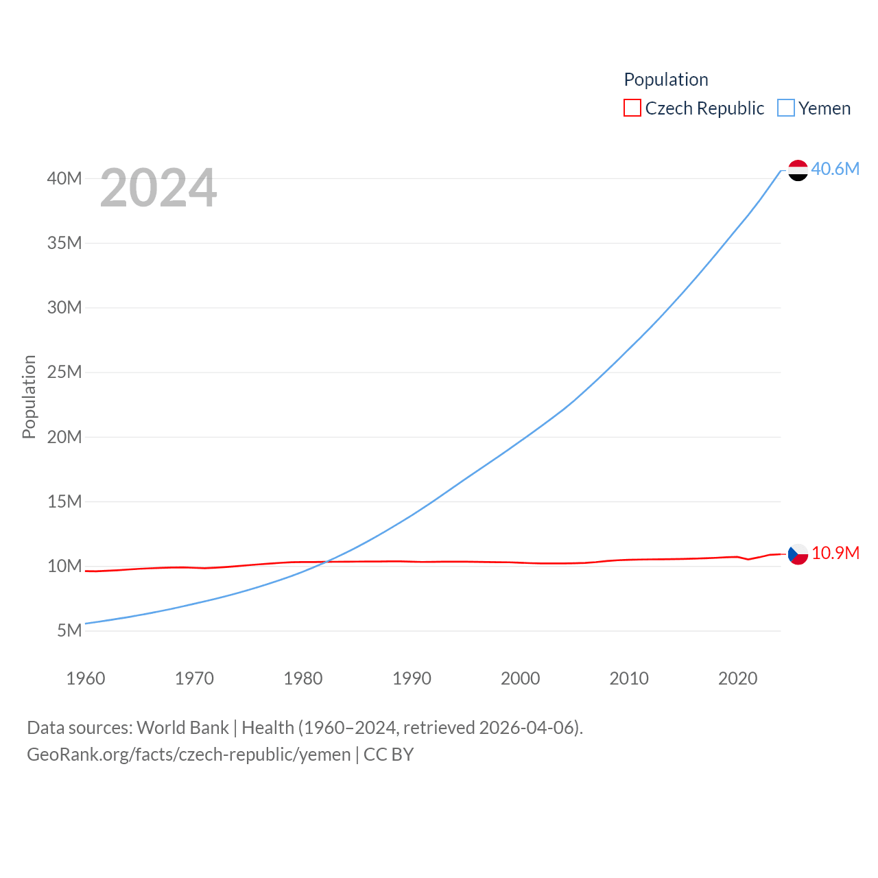 The Czech Republic has a population of 10.9M (ranked 88/197), compared with 40.6M in Yemen (ranked 38/197). The Czech Republic's land area is 29,794 sq mi versus 203,850 sq mi for Yemen (ranked 114th vs. 49th).