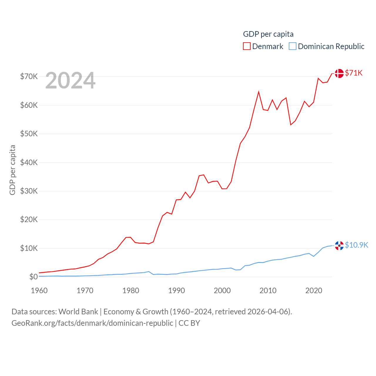 By GDP, Denmark ranks 37/197 ($425B) and The Dominican Republic ranks 63/197 ($124B). By GDP per capita, Denmark ranks 12/197 ($71,026), while The Dominican Republic ranks 83/197 ($10,876).
