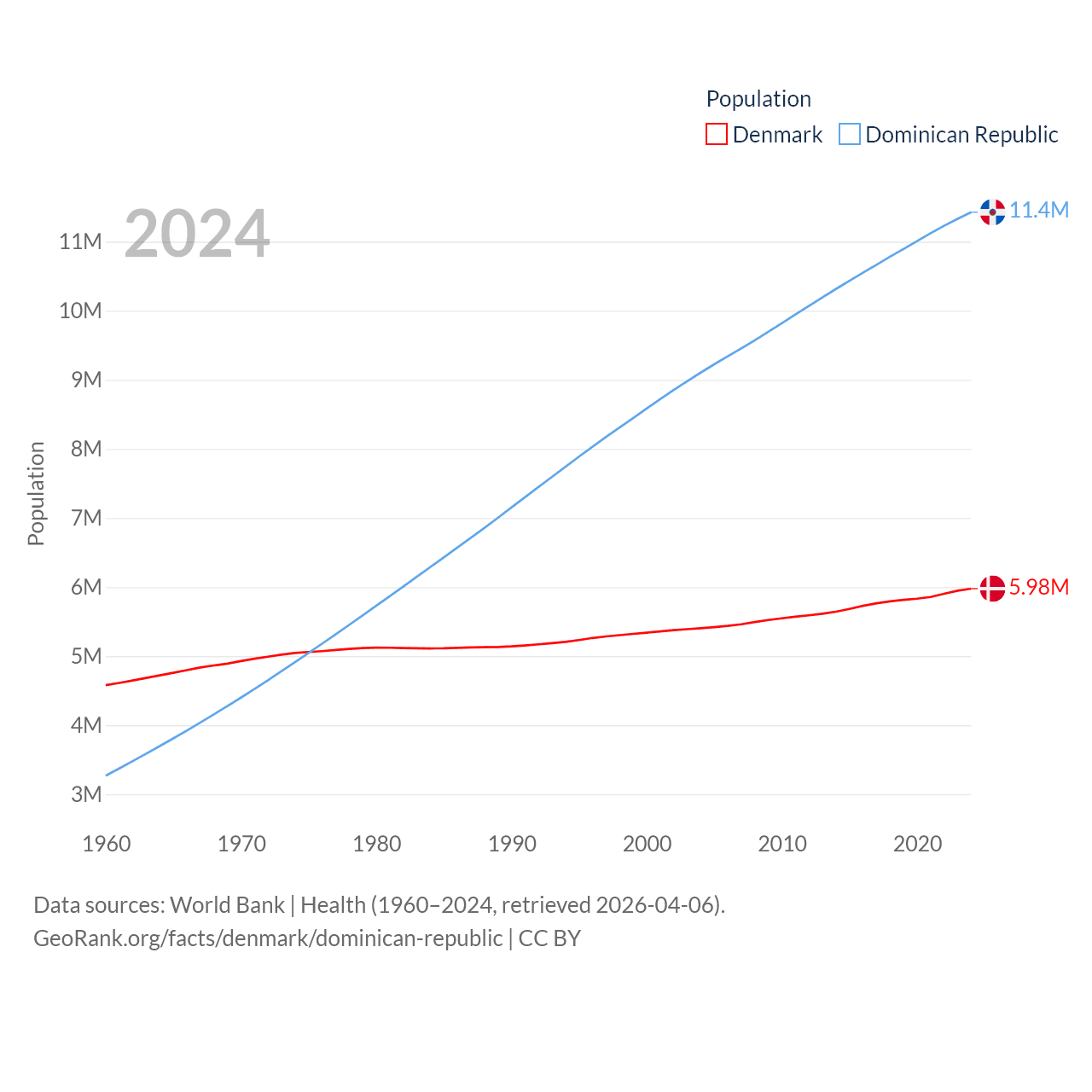 Denmark has a population of 5.98M (ranked 114/197), compared with 11.4M in The Dominican Republic (ranked 85/197). Denmark's land area is 15,444 sq mi versus 18,609 sq mi for The Dominican Republic (ranked 130th vs. 127th).