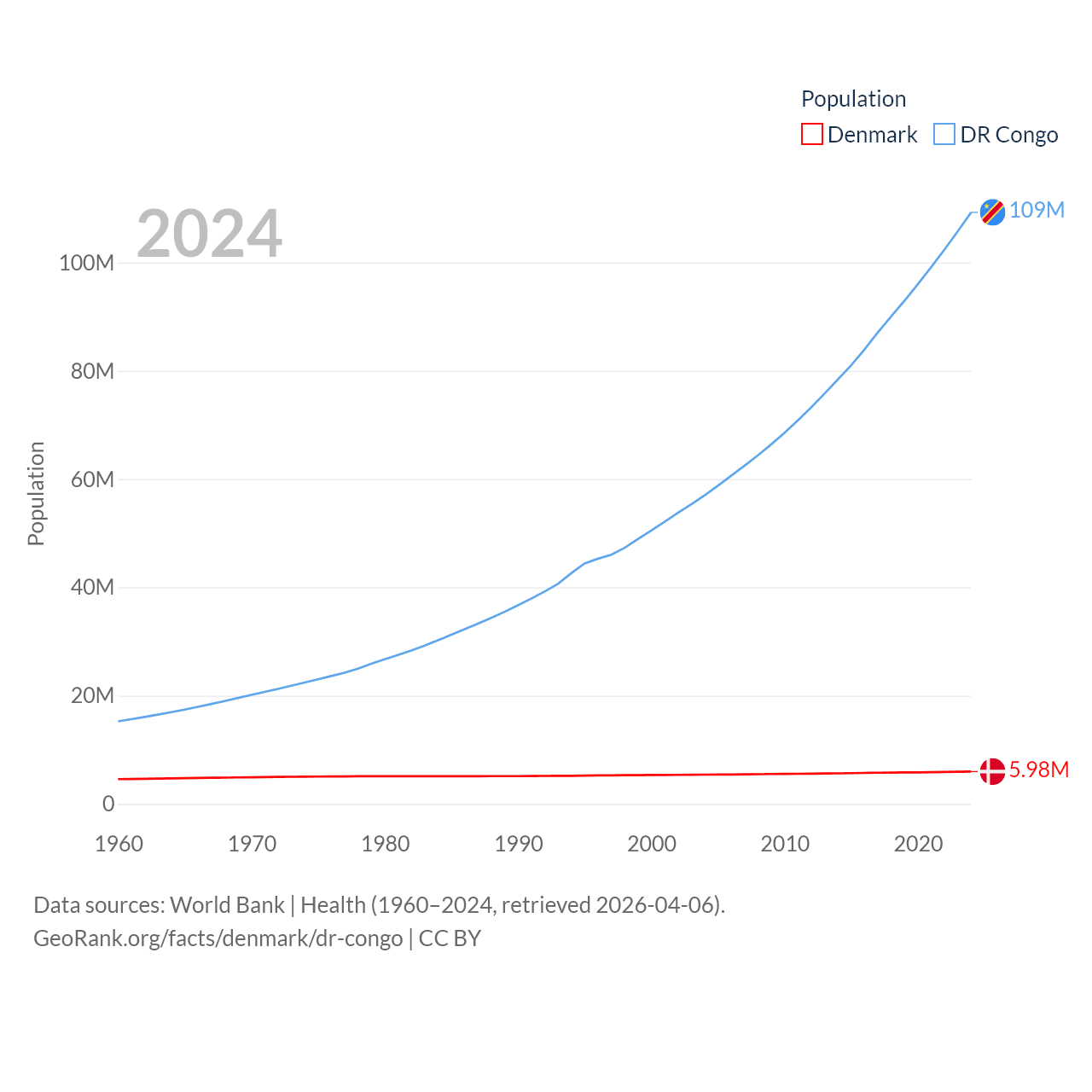 Denmark has a population of 5.98M (ranked 114/197), compared with 109M in The DR Congo (ranked 15/197). Denmark's land area is 15,444 sq mi versus 875,313 sq mi for The DR Congo (ranked 130th vs. 11th).