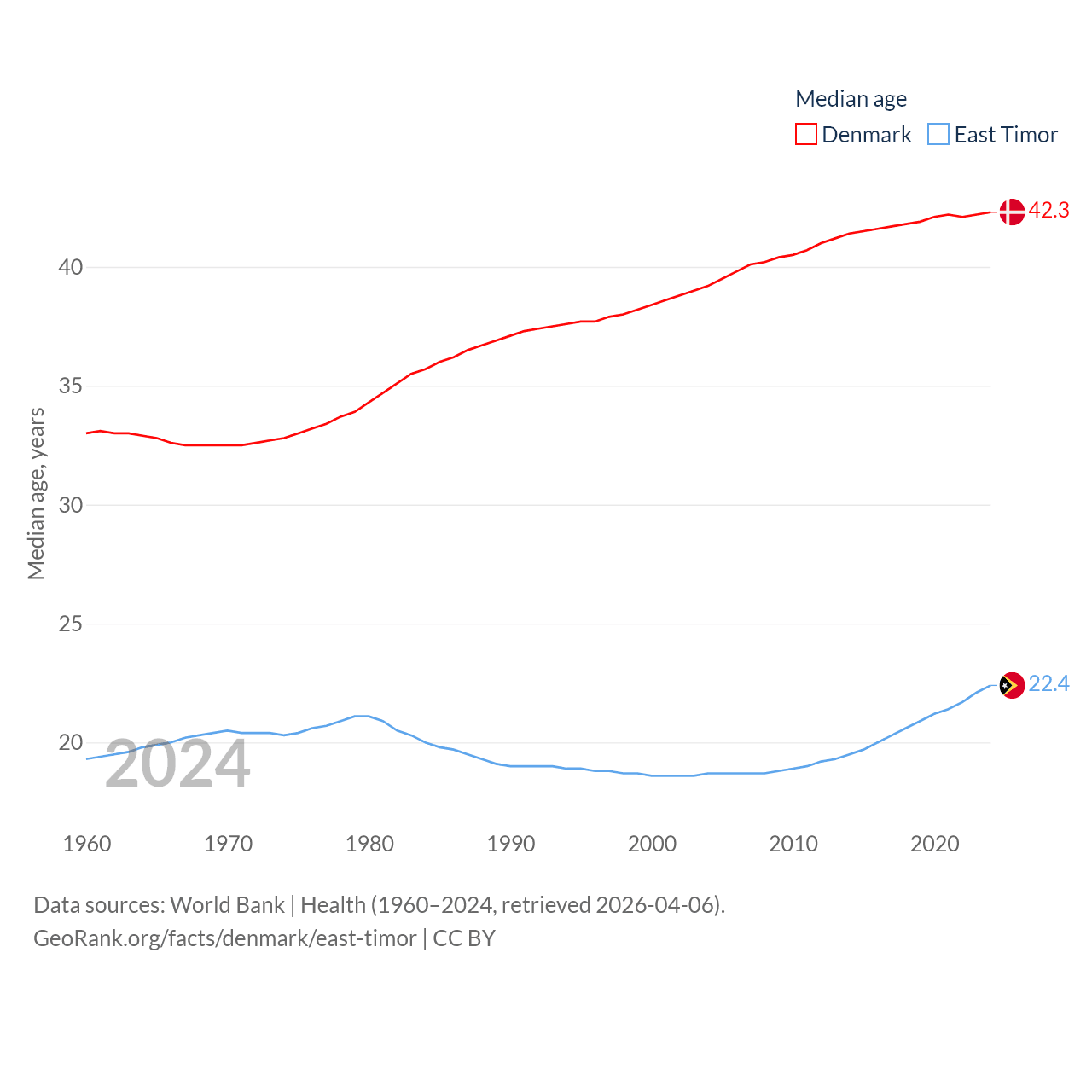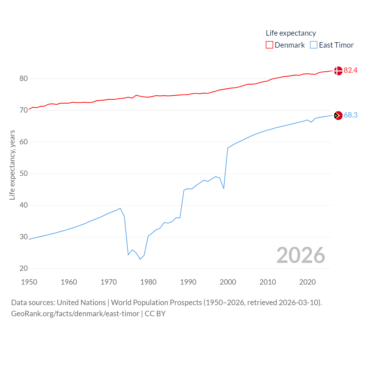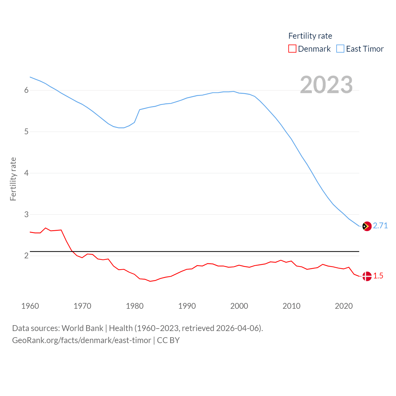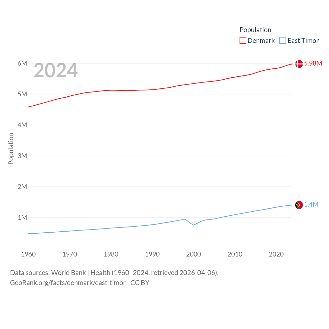Denmark has a population of 5.98M (ranked 114/197), compared with 1.4M in East Timor (ranked 152/197). Denmark's land area is 15,444 sq mi versus 5,741 sq mi for East Timor (ranked 130th vs. 155th).