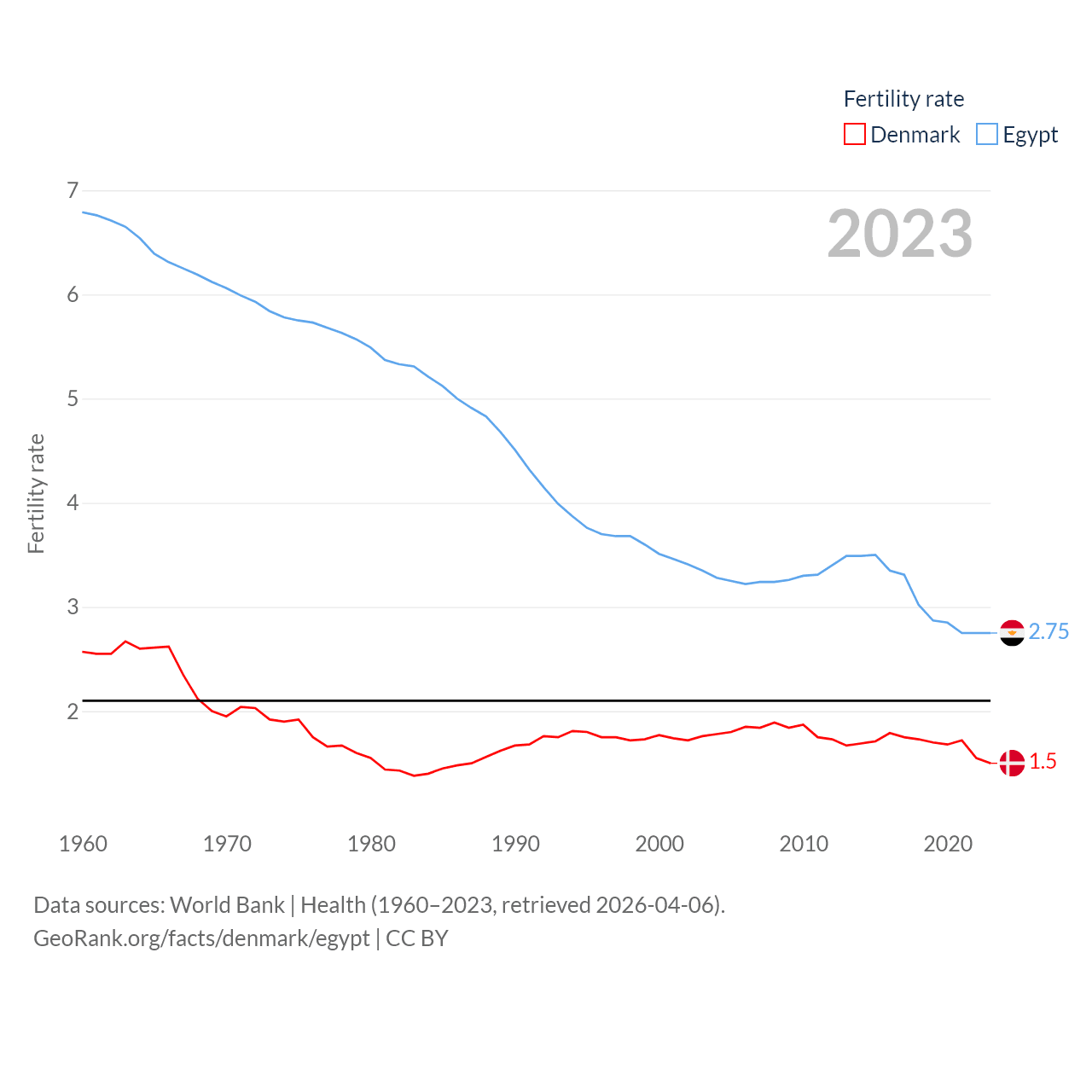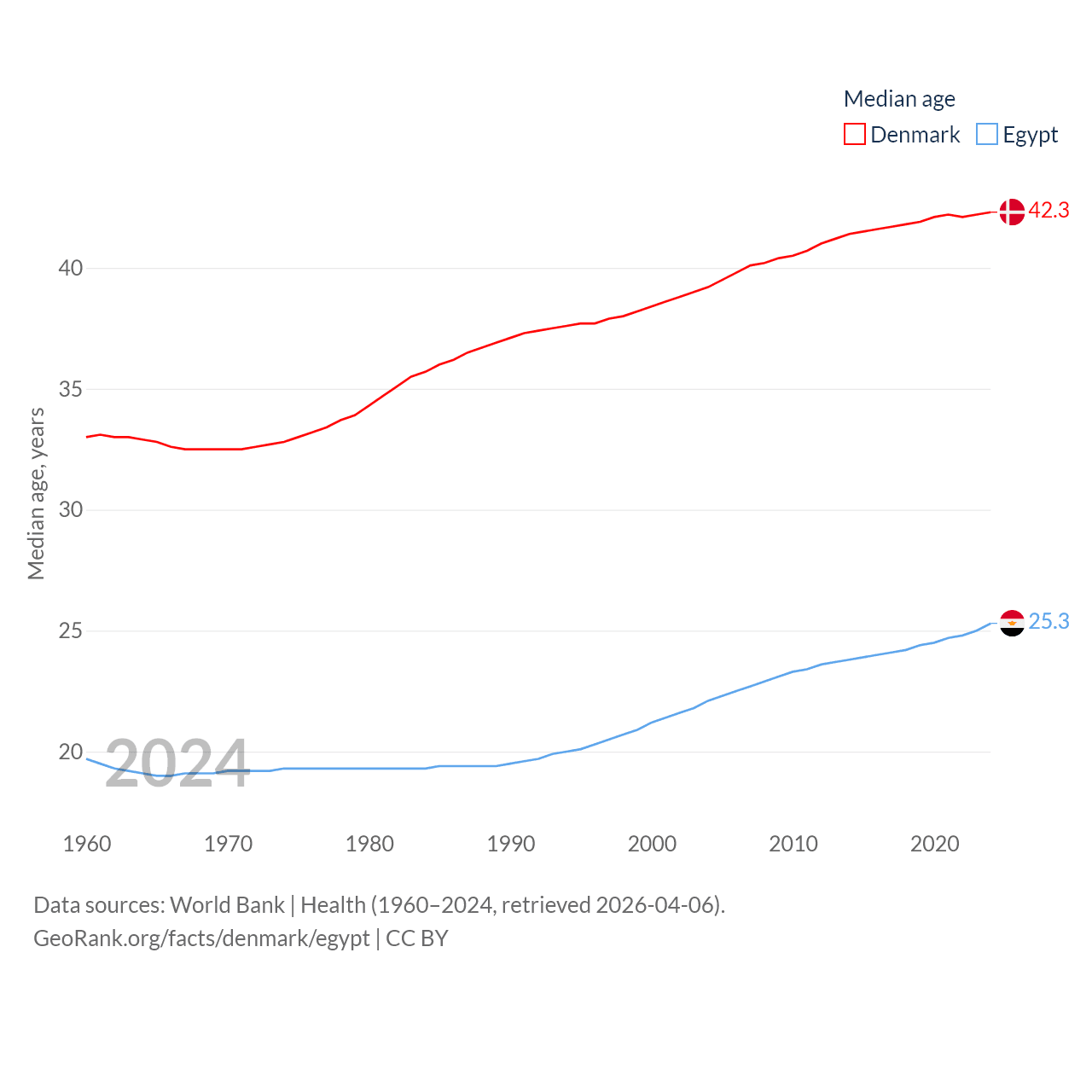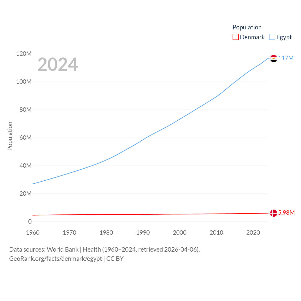 Denmark has a population of 5.98M (ranked 114/197), compared with 117M in Egypt (ranked 13/197). Denmark's land area is 15,444 sq mi versus 384,345 sq mi for Egypt (ranked 130th vs. 29th).