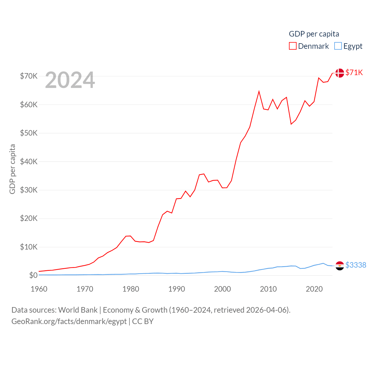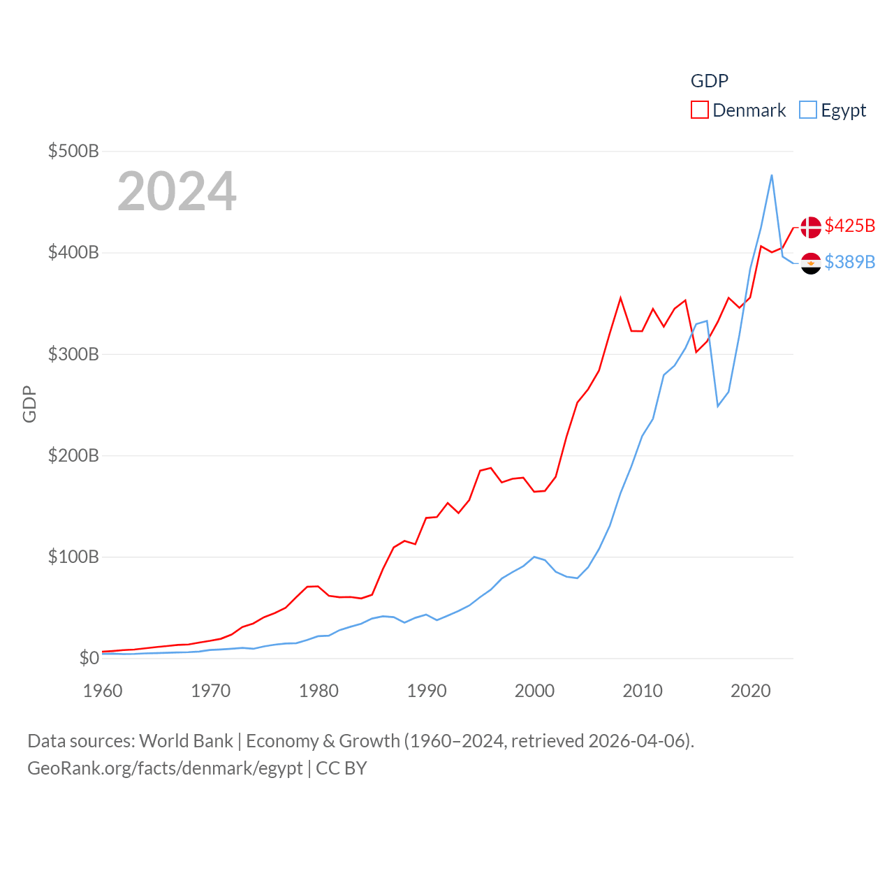 By GDP, Denmark ranks 37/197 ($425B) and Egypt ranks 41/197 ($389B). By GDP per capita, Denmark ranks 12/197 ($71,026), while Egypt ranks 138/197 ($3,338).