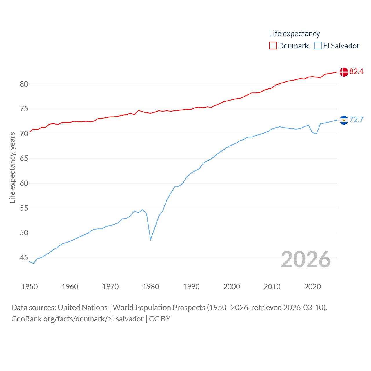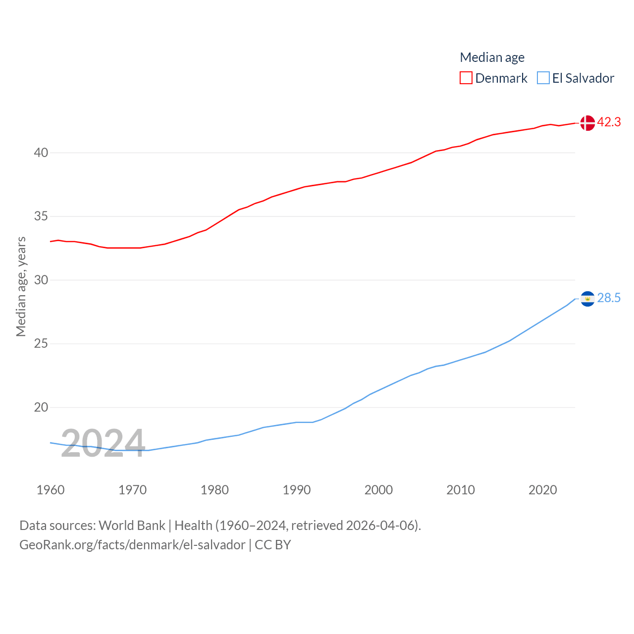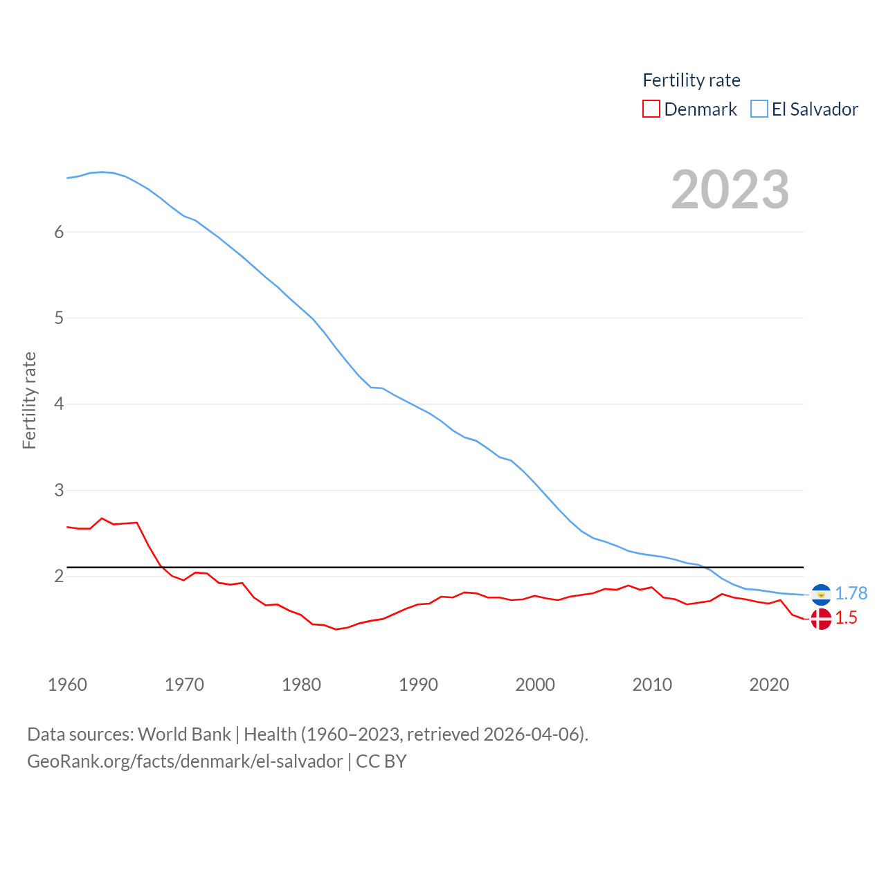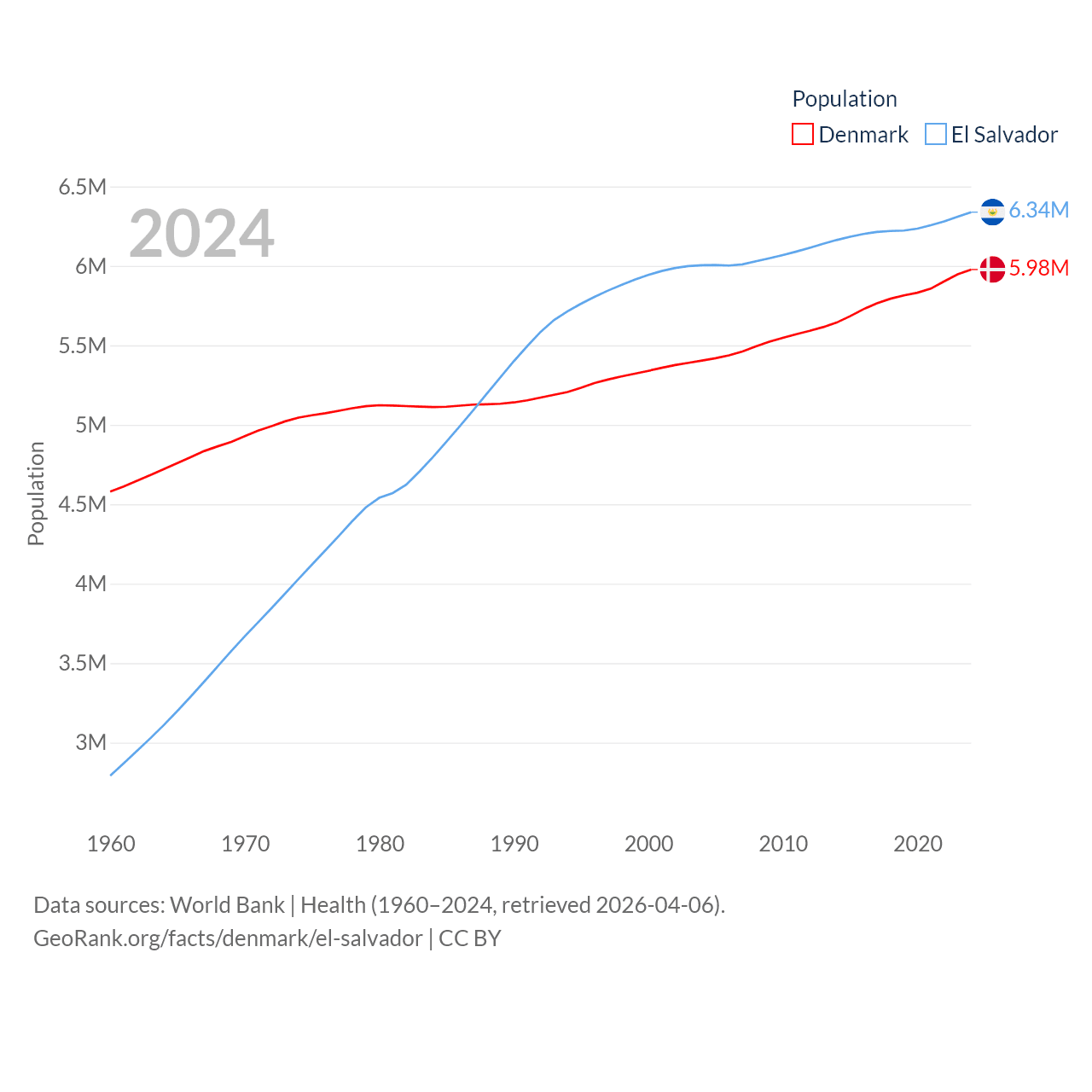 Denmark has a population of 5.98M (ranked 114/197), compared with 6.34M in El Salvador (ranked 111/197). Denmark's land area is 15,444 sq mi versus 8,000 sq mi for El Salvador (ranked 130th vs. 150th).