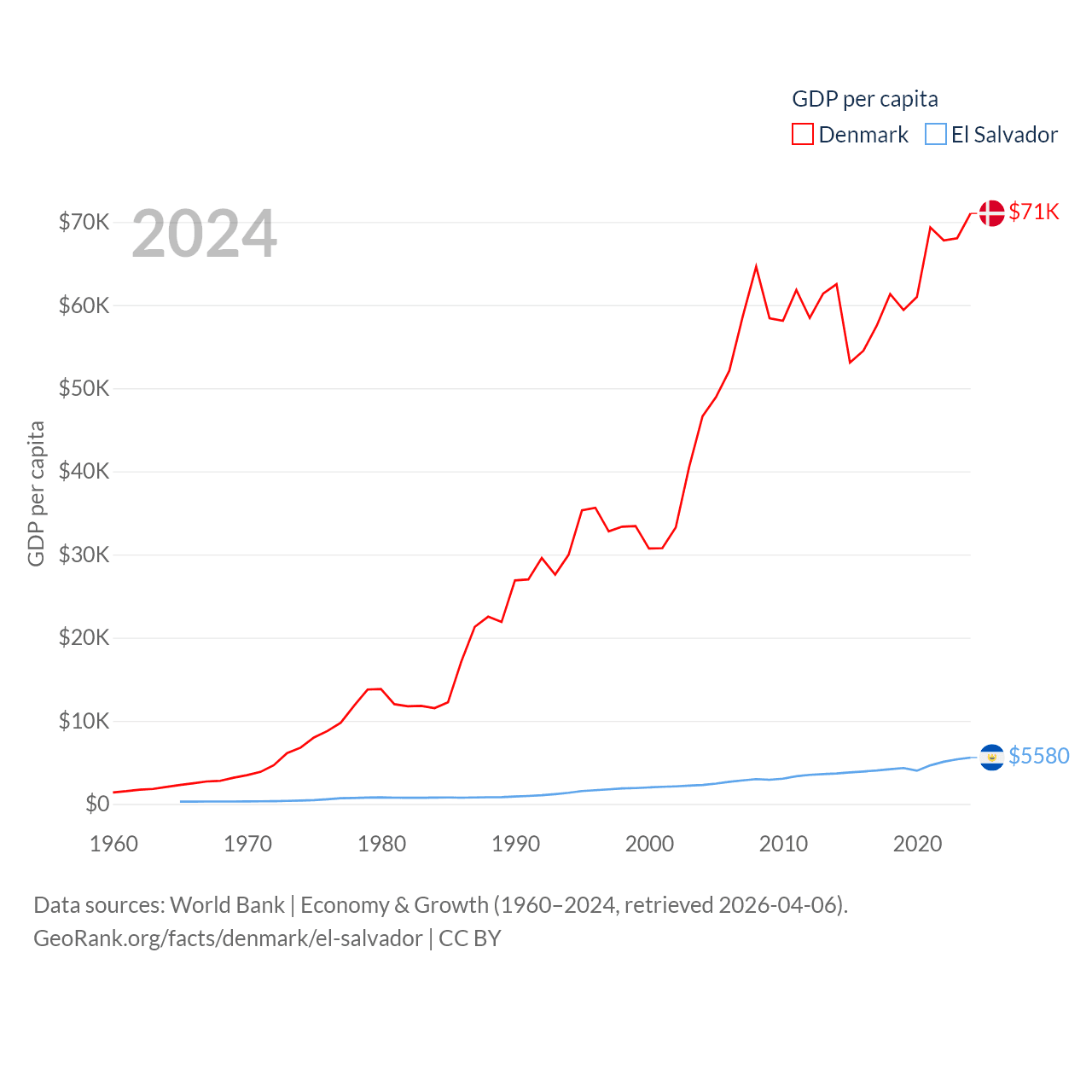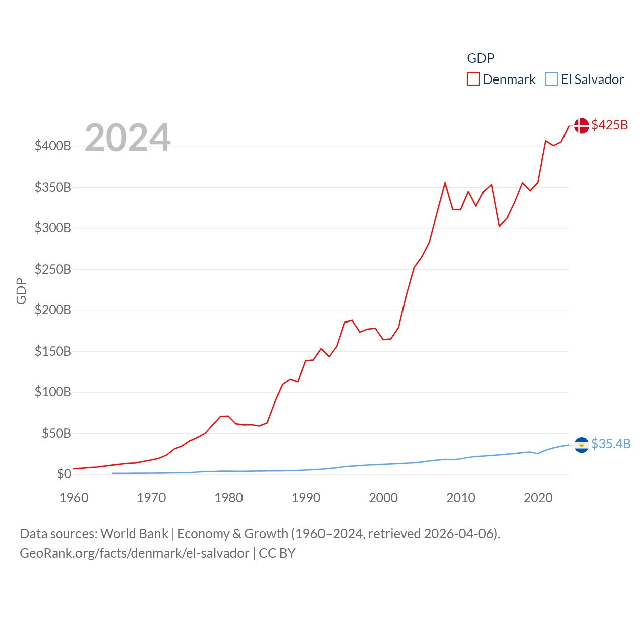 By GDP, Denmark ranks 37/197 ($425B) and El Salvador ranks 105/197 ($35.4B). By GDP per capita, Denmark ranks 12/197 ($71,026), while El Salvador ranks 116/197 ($5,580).