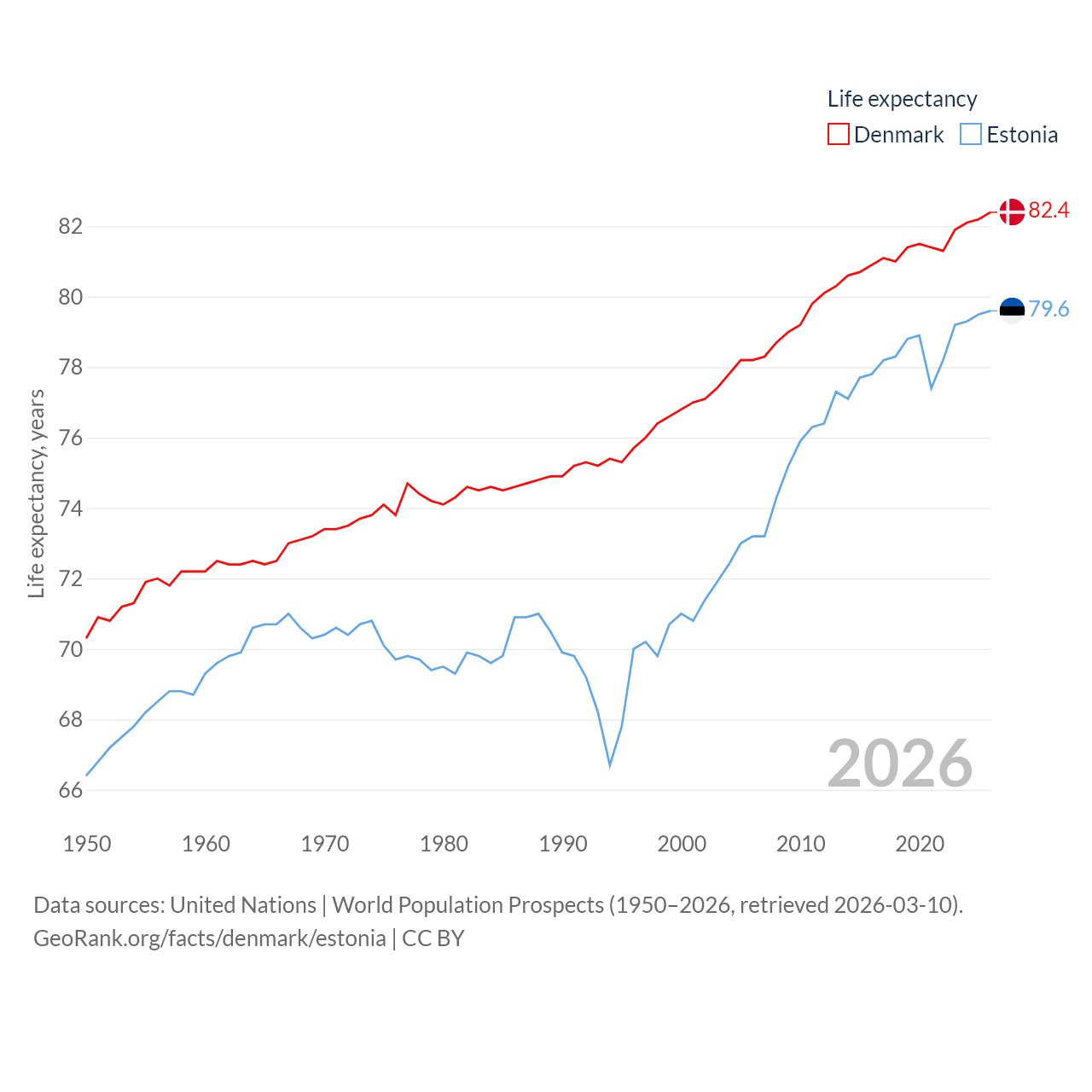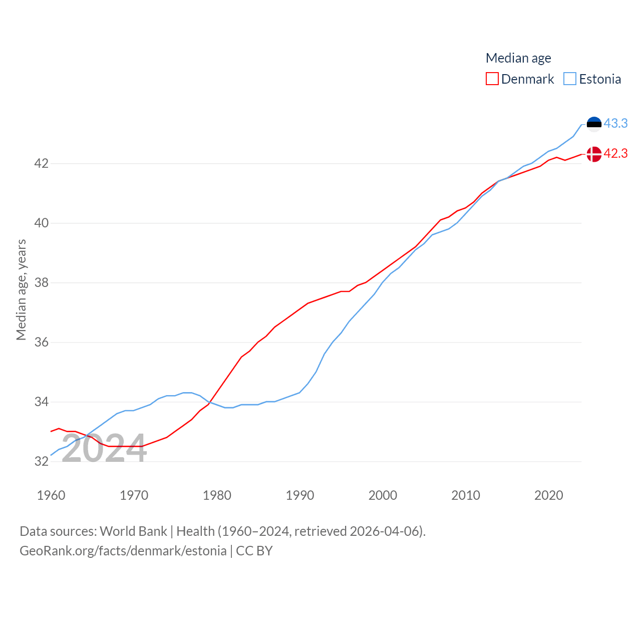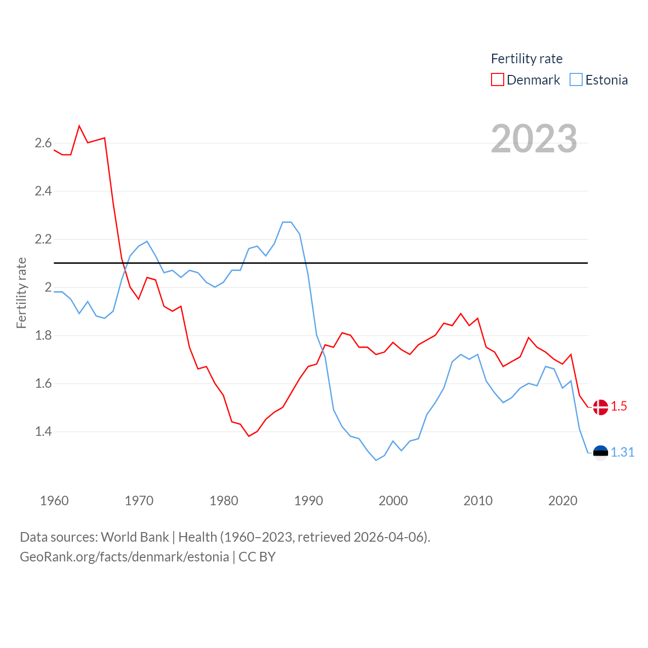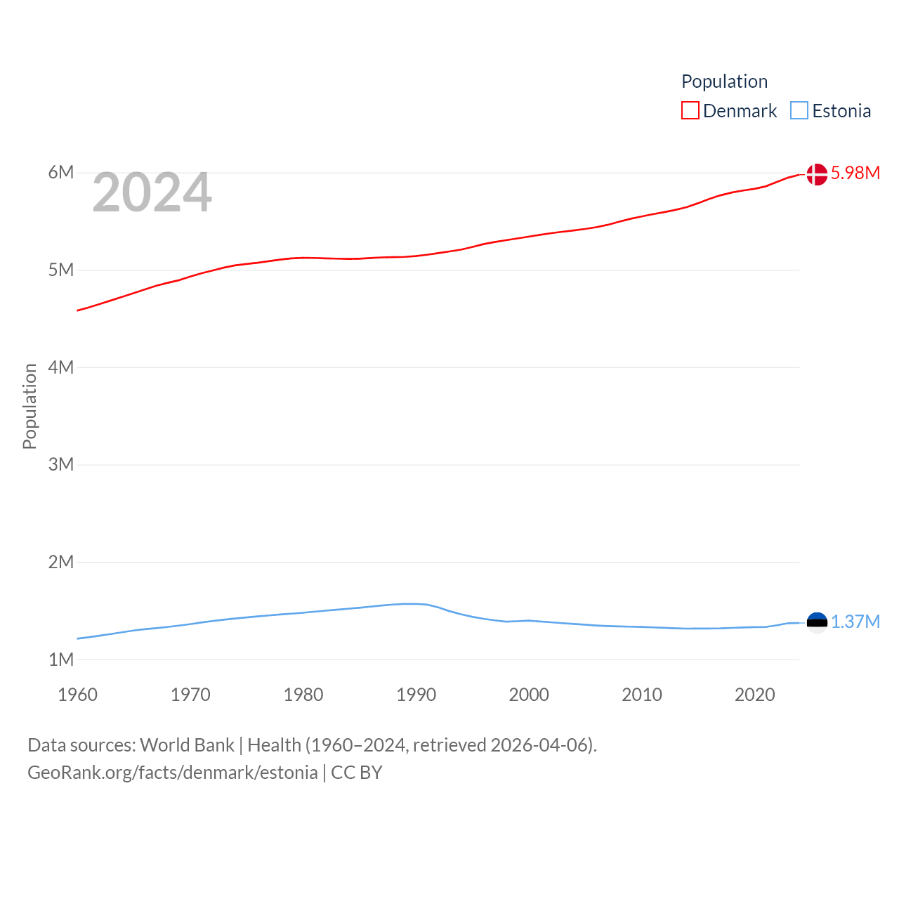 Denmark has a population of 5.98M (ranked 114/197), compared with 1.37M in Estonia (ranked 153/197). Denmark's land area is 15,444 sq mi versus 16,498 sq mi for Estonia (ranked 130th vs. 129th).