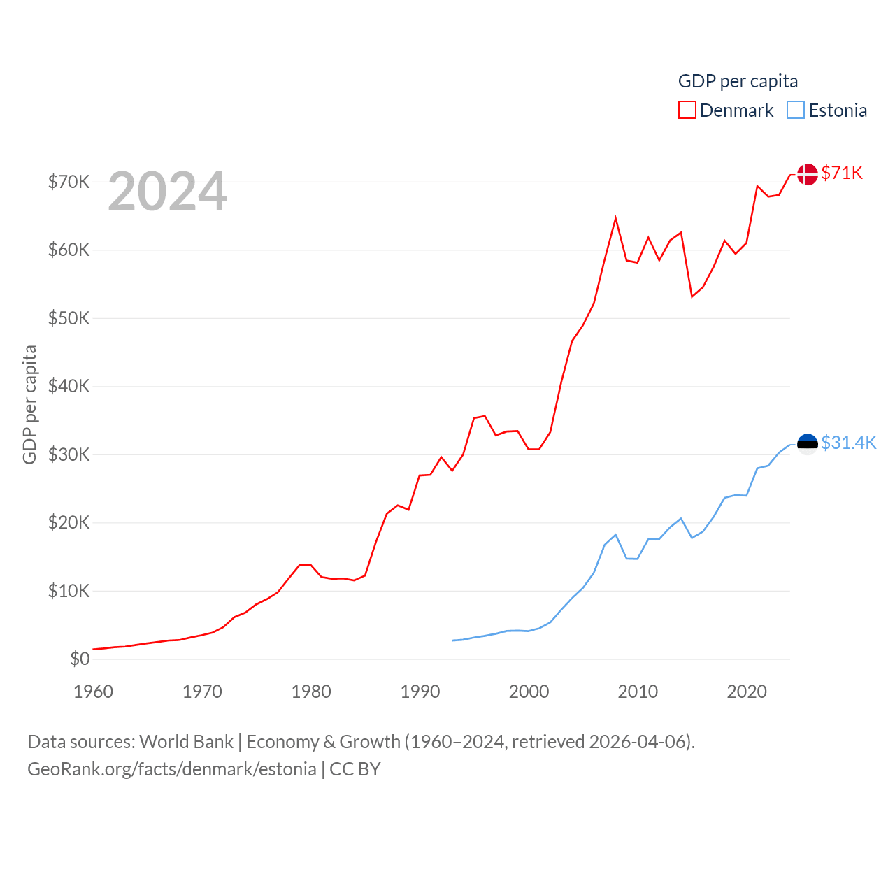 By GDP, Denmark ranks 37/197 ($425B) and Estonia ranks 100/197 ($43.1B). By GDP per capita, Denmark ranks 12/197 ($71,026), while Estonia ranks 40/197 ($31,428).