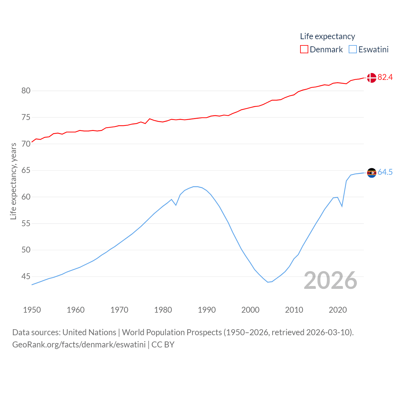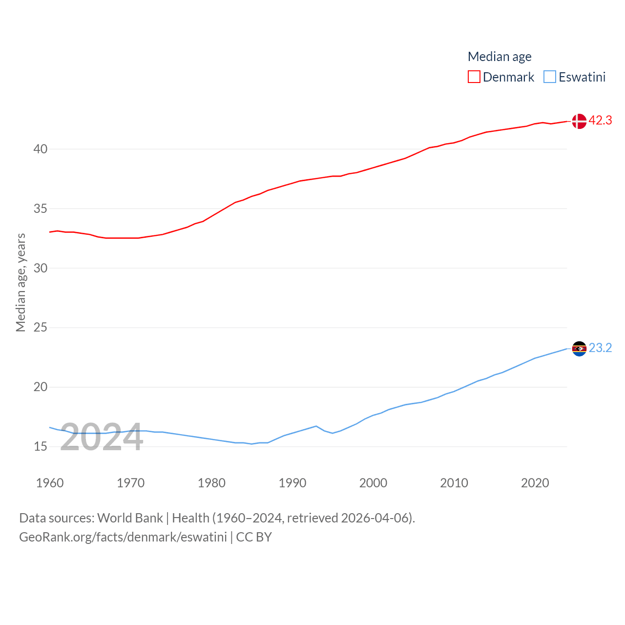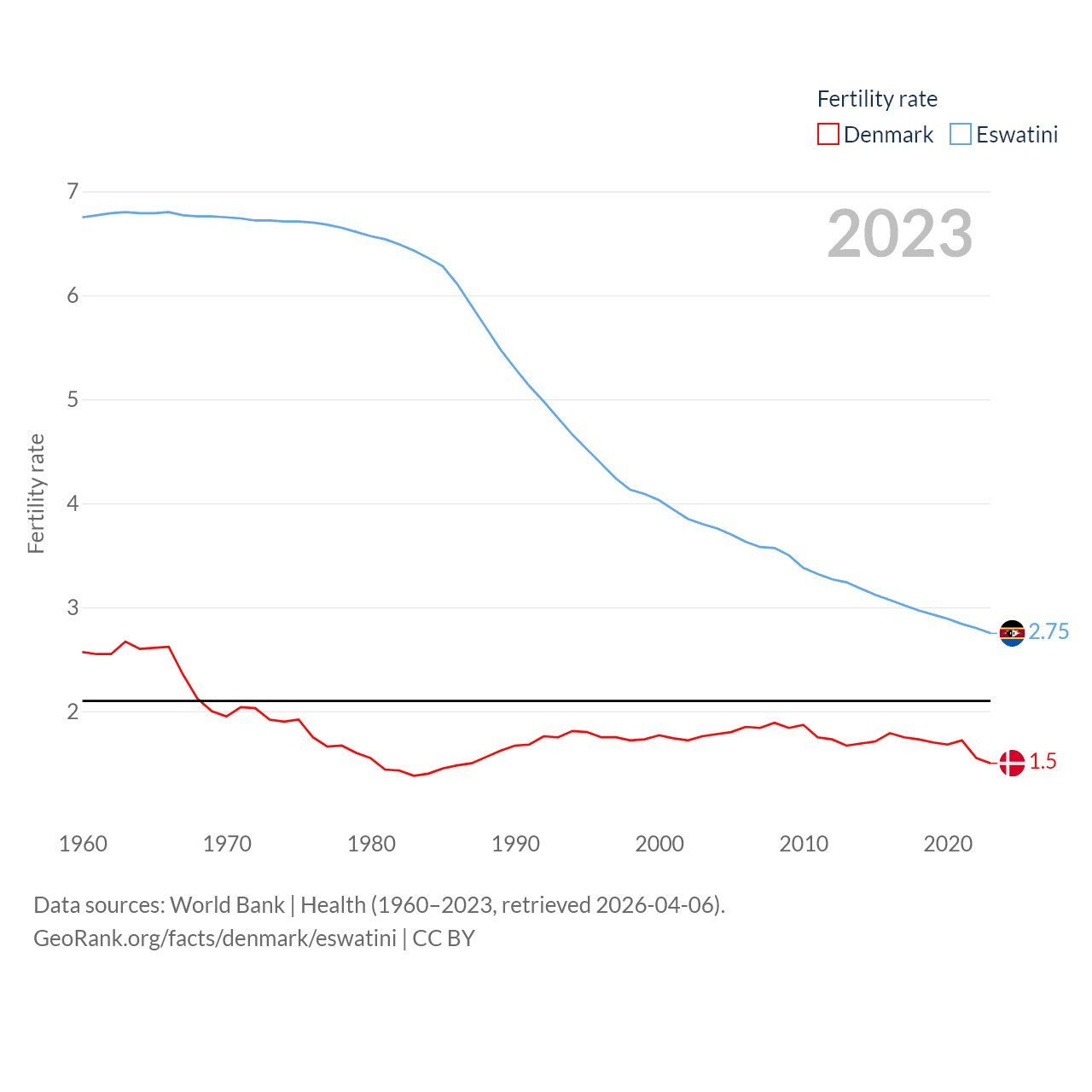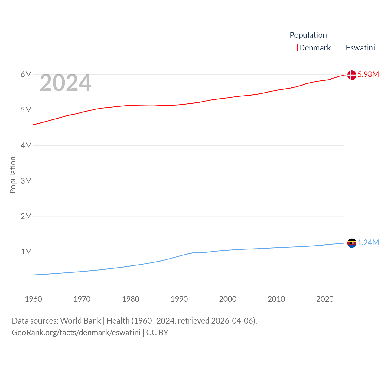 Denmark has a population of 5.98M (ranked 114/197), compared with 1.24M in Eswatini (ranked 157/197). Denmark's land area is 15,444 sq mi versus 6,641 sq mi for Eswatini (ranked 130th vs. 154th).