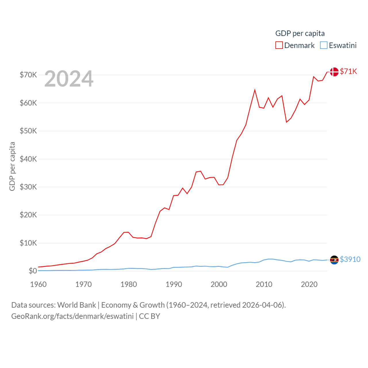 By GDP, Denmark ranks 37/197 ($425B) and Eswatini ranks 162/197 ($4.86B). By GDP per capita, Denmark ranks 12/197 ($71,026), while Eswatini ranks 131/197 ($3,910).
