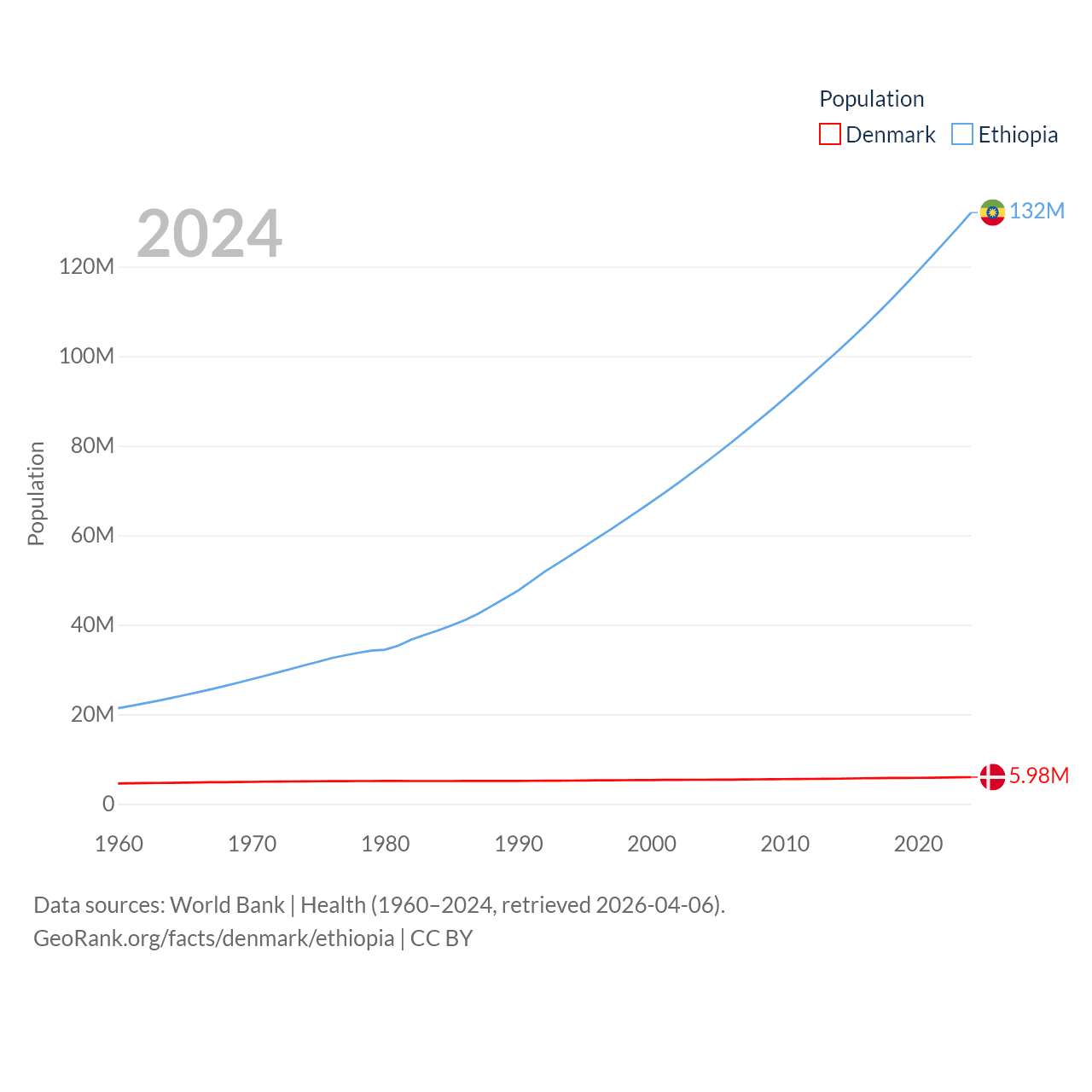 Denmark has a population of 5.98M (ranked 114/197), compared with 132M in Ethiopia (ranked 10/197). Denmark's land area is 15,444 sq mi versus 435,716 sq mi for Ethiopia (ranked 130th vs. 25th).
