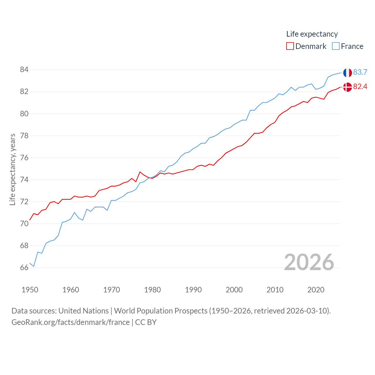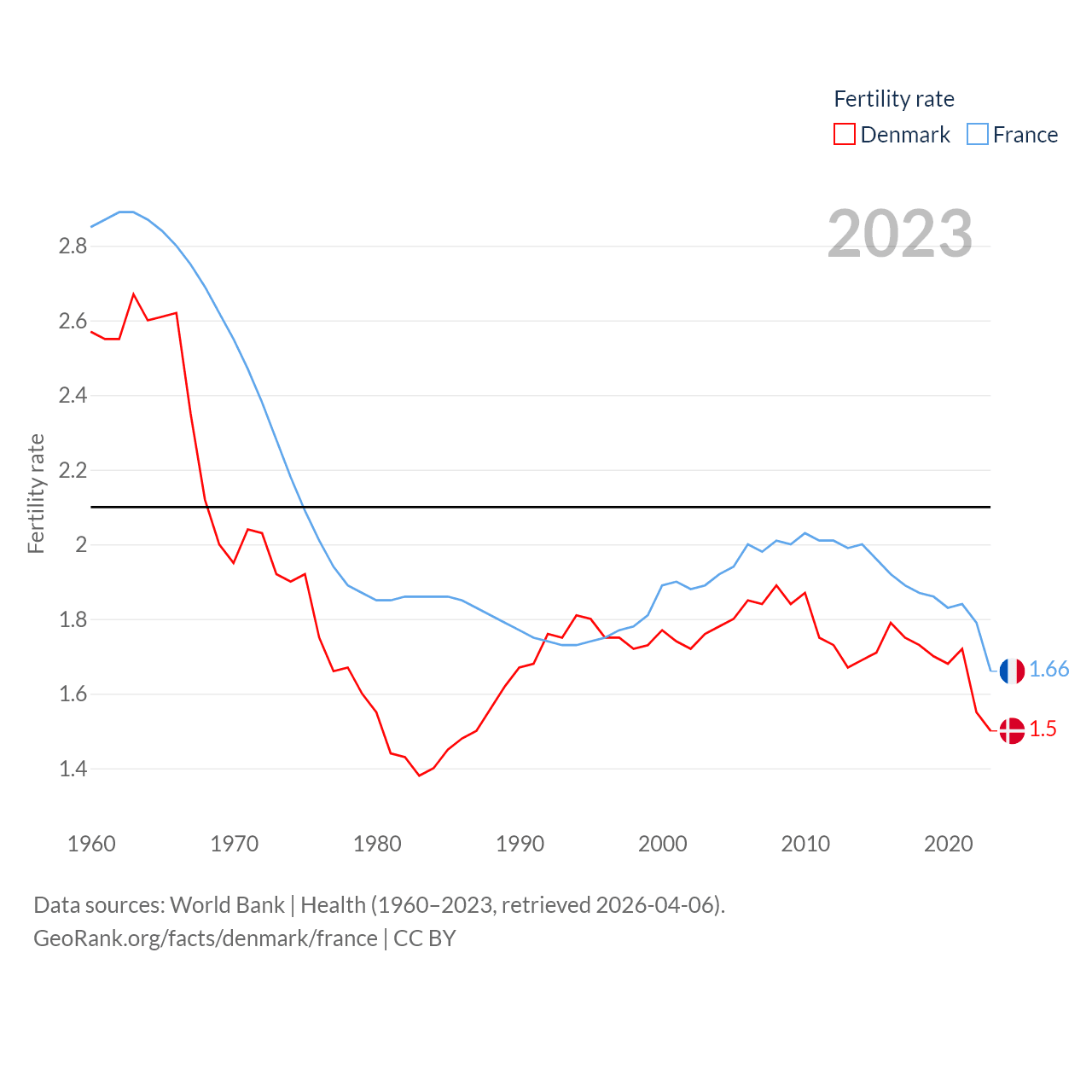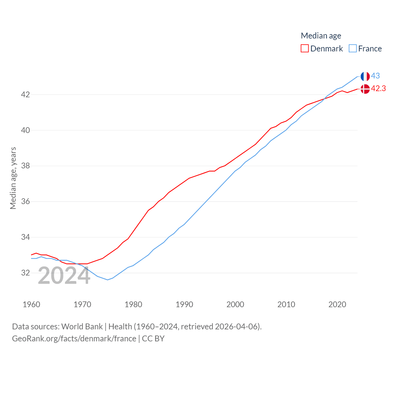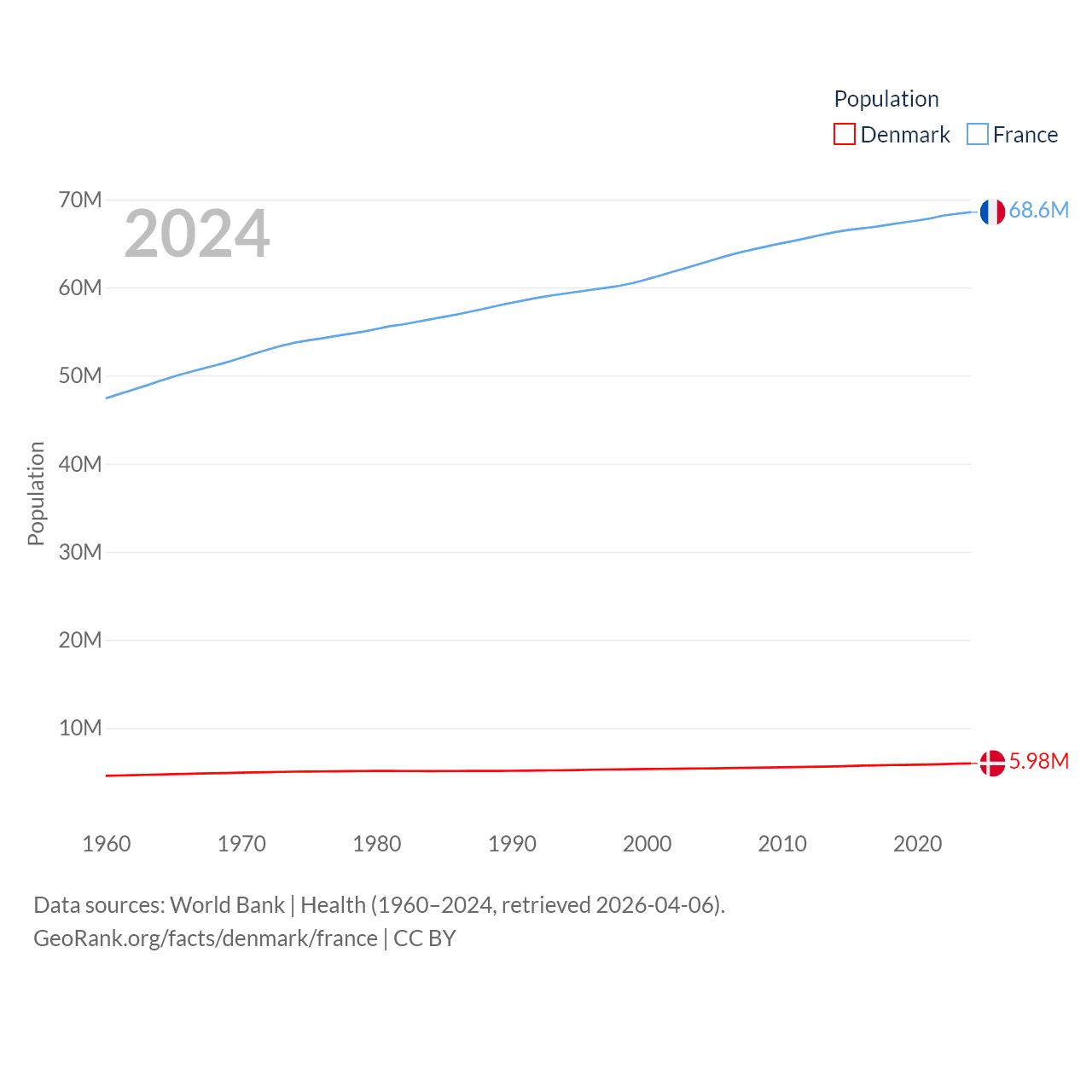 Denmark has a population of 5.98M (ranked 114/197), compared with 68.6M in France (ranked 23/197). Denmark's land area is 15,444 sq mi versus 208,090 sq mi for France (ranked 130th vs. 48th).