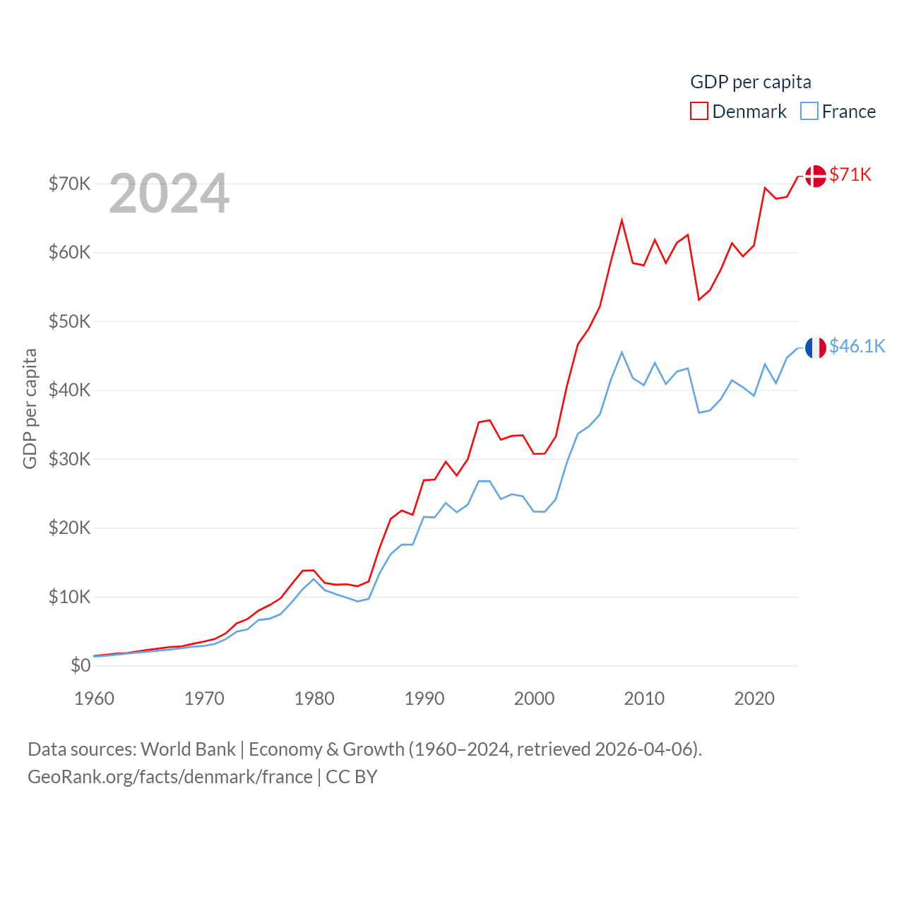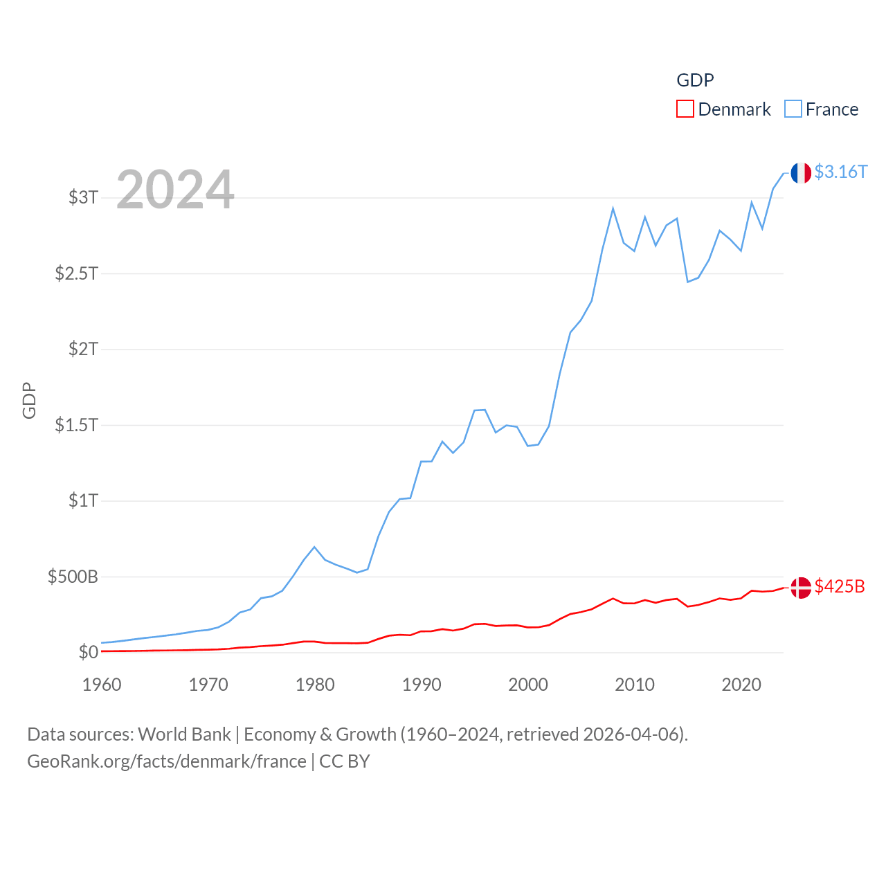 By GDP, Denmark ranks 37/197 ($425B) and France ranks 7/197 ($3.16T). By GDP per capita, Denmark ranks 12/197 ($71,026), while France ranks 27/197 ($46,103).