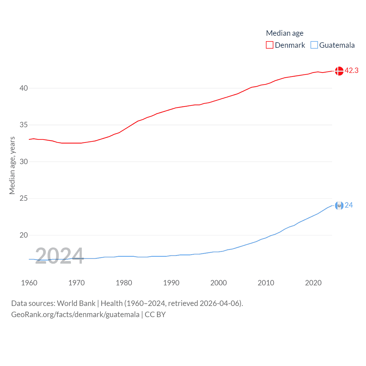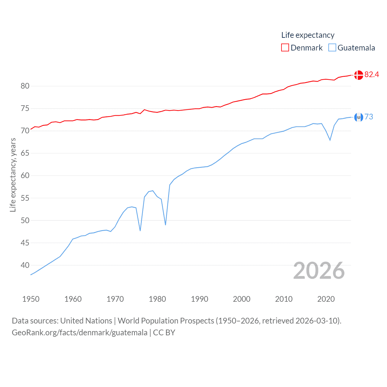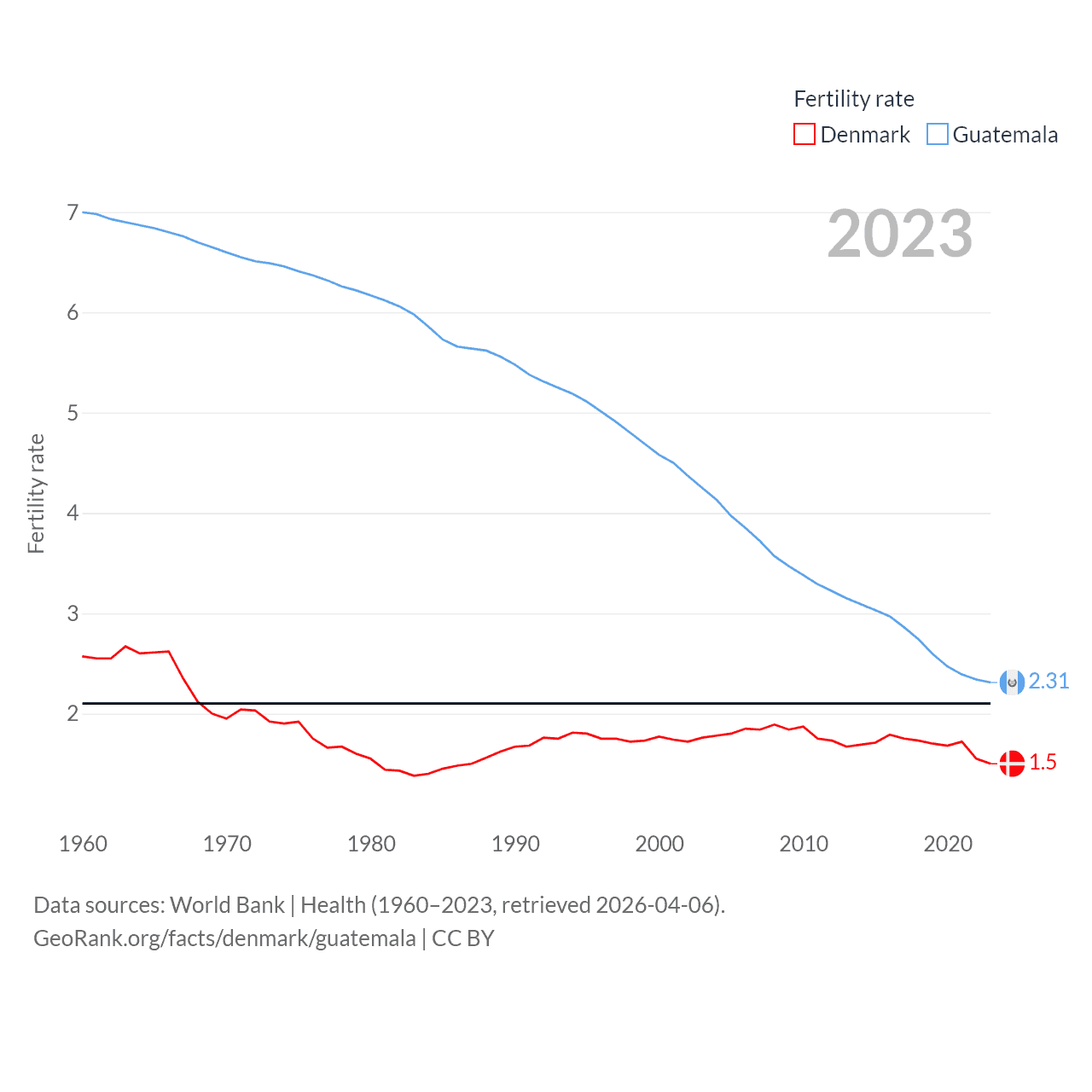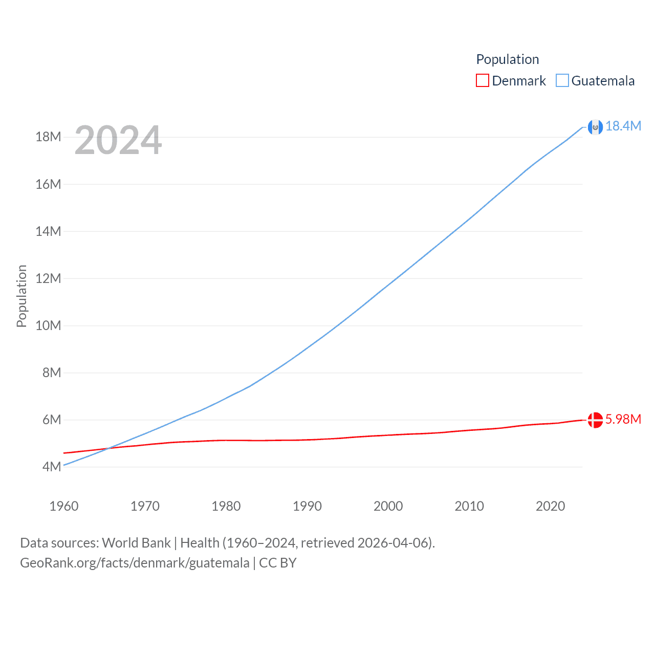 Denmark has a population of 5.98M (ranked 114/197), compared with 18.4M in Guatemala (ranked 70/197). Denmark's land area is 15,444 sq mi versus 41,375 sq mi for Guatemala (ranked 130th vs. 102nd).