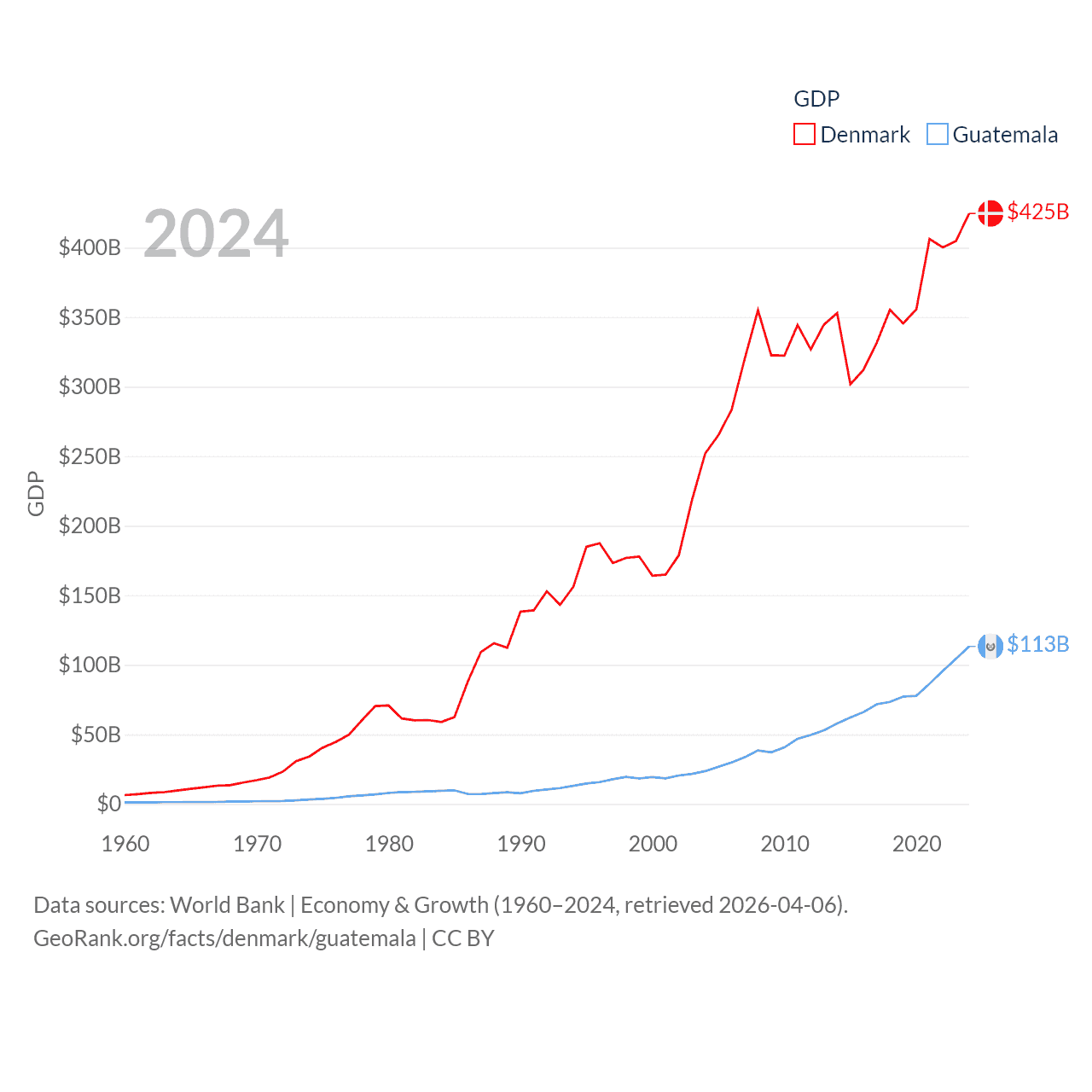 By GDP, Denmark ranks 37/197 ($425B) and Guatemala ranks 68/197 ($113B). By GDP per capita, Denmark ranks 12/197 ($71,026), while Guatemala ranks 112/197 ($6,150).