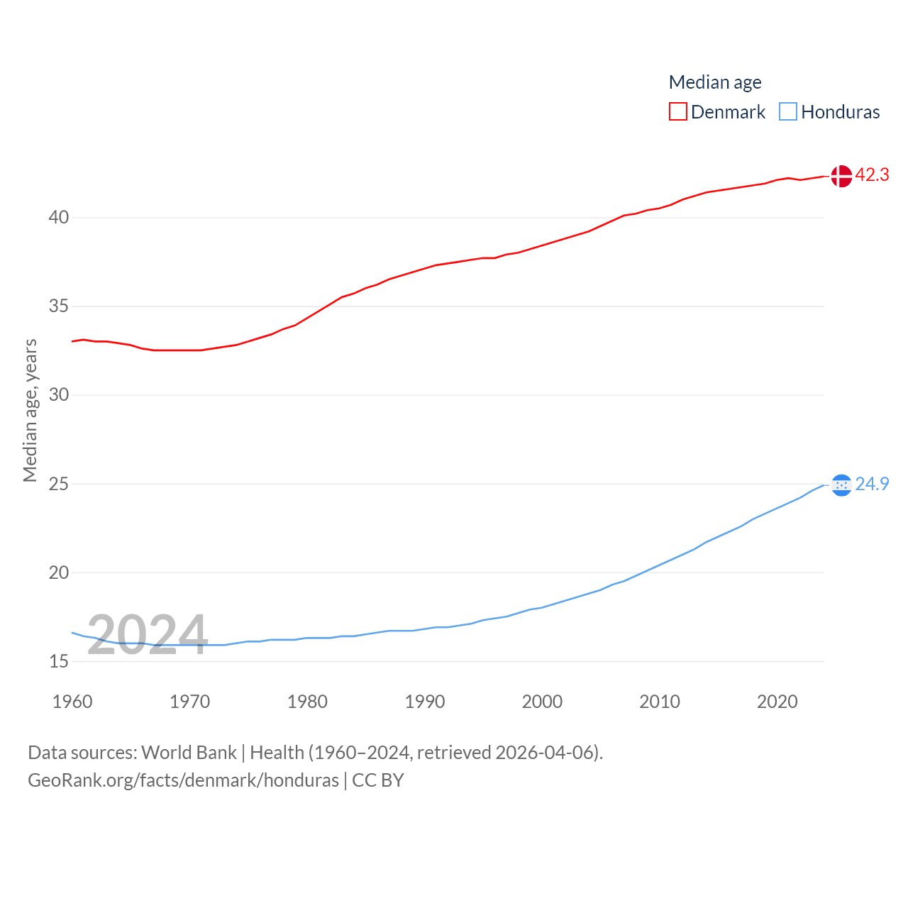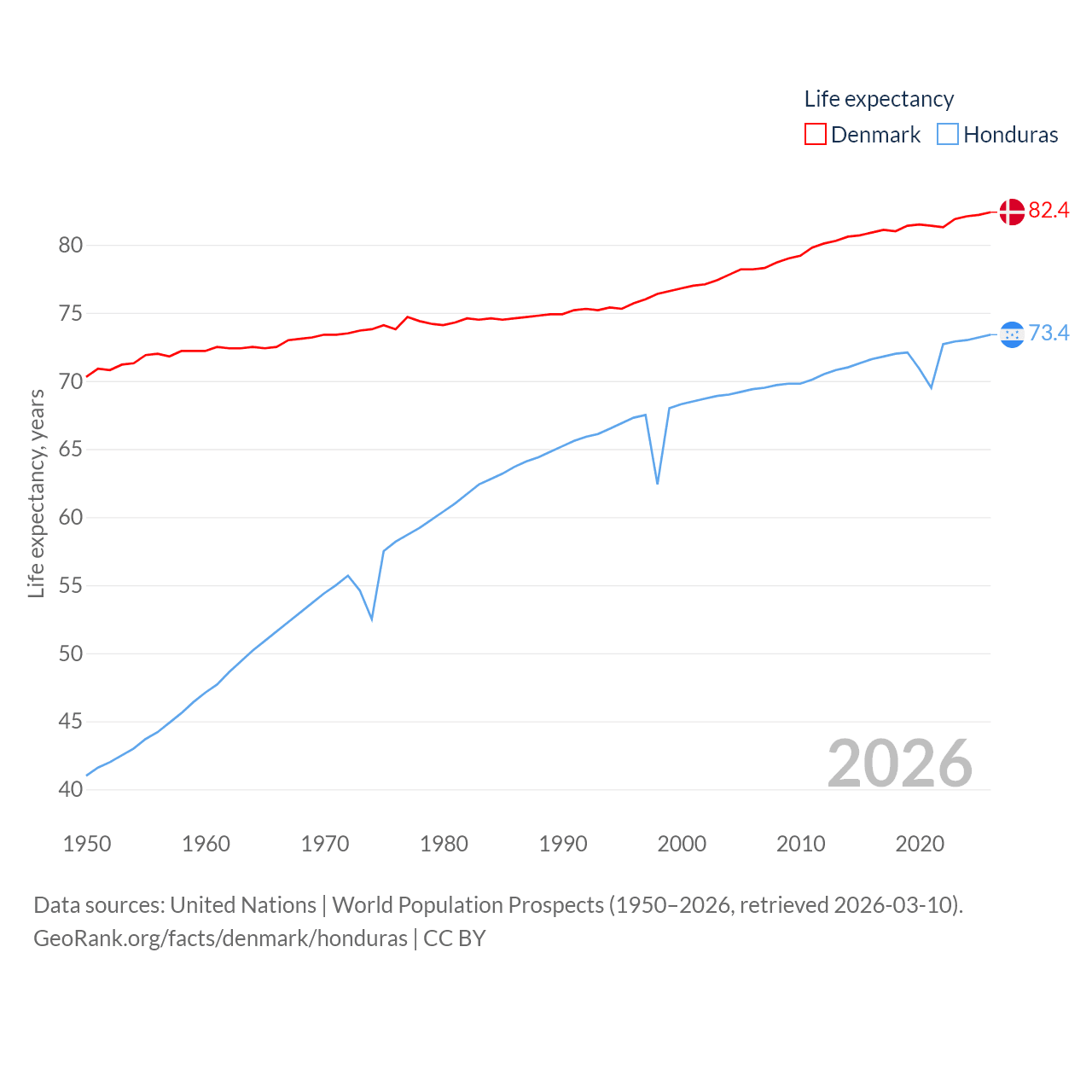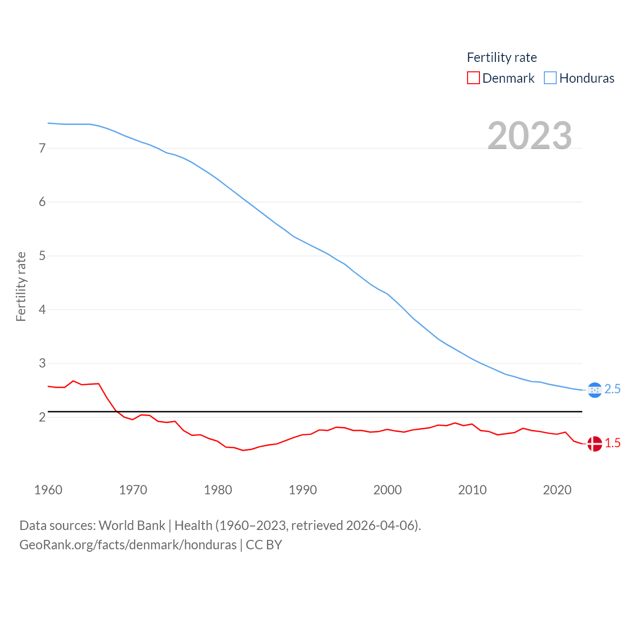 Denmark has a population of 5.98M (ranked 114/197), compared with 10.8M in Honduras (ranked 89/197). Denmark's land area is 15,444 sq mi versus 43,201 sq mi for Honduras (ranked 130th vs. 100th).