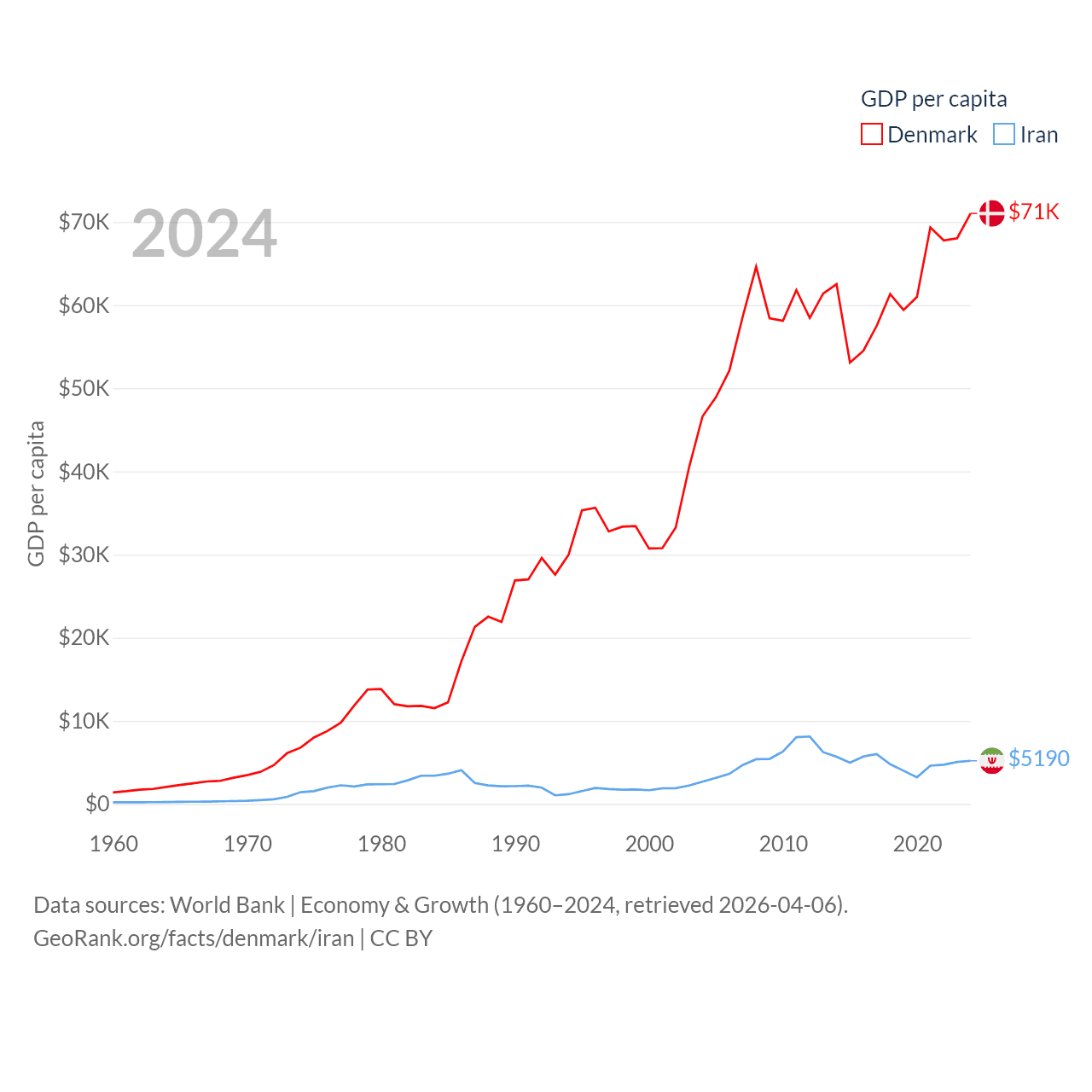 By GDP, Denmark ranks 37/197 ($425B) and Iran ranks 34/197 ($475B). By GDP per capita, Denmark ranks 12/197 ($71,026), while Iran ranks 119/197 ($5,190).