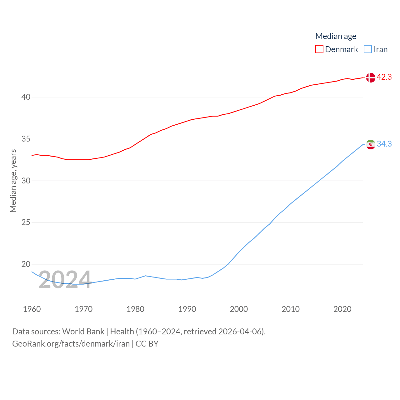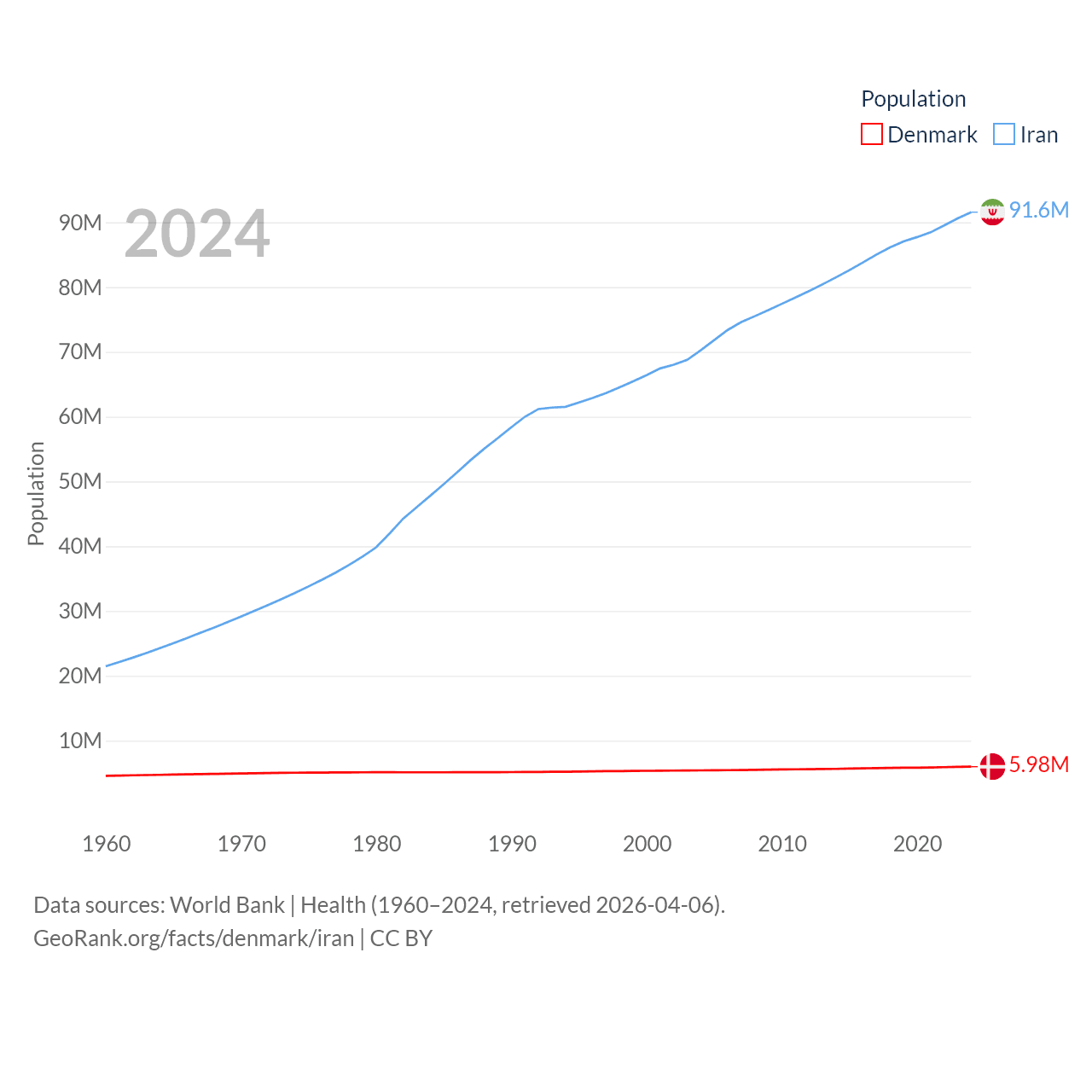 Denmark has a population of 5.98M (ranked 114/197), compared with 91.6M in Iran (ranked 17/197). Denmark's land area is 15,444 sq mi versus 626,451 sq mi for Iran (ranked 130th vs. 17th).