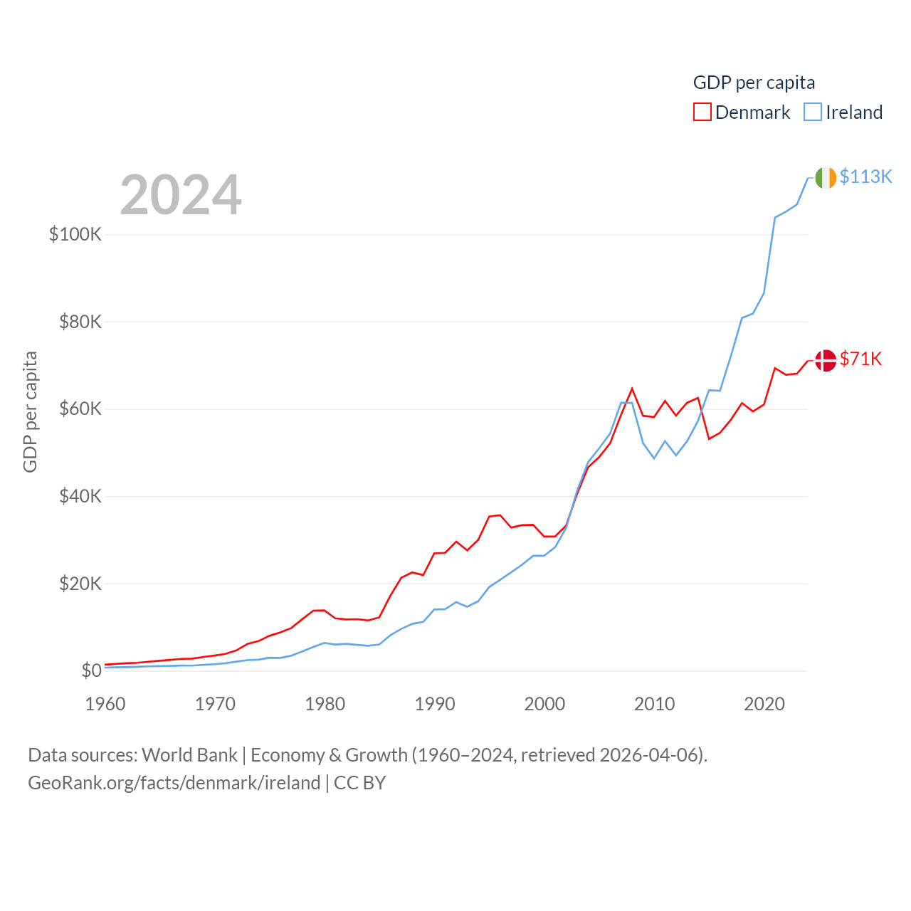 By GDP, Denmark ranks 37/197 ($425B) and Ireland ranks 25/197 ($609B). By GDP per capita, Denmark ranks 12/197 ($71,026), while Ireland ranks 4/197 ($112,895).